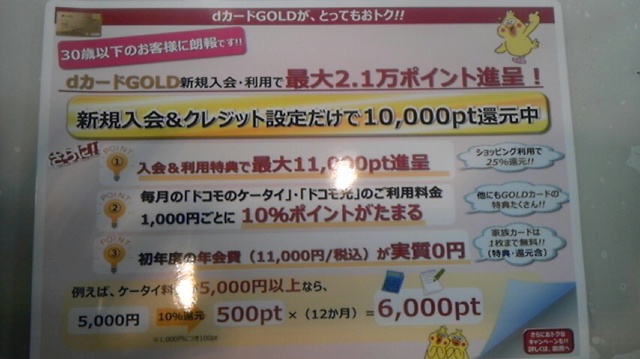 dカードGOLDなら、ただ今30歳以下の方の新規入会&クレジット設定で、10,000ポイント進呈のキャンペーン中です(´ω`)