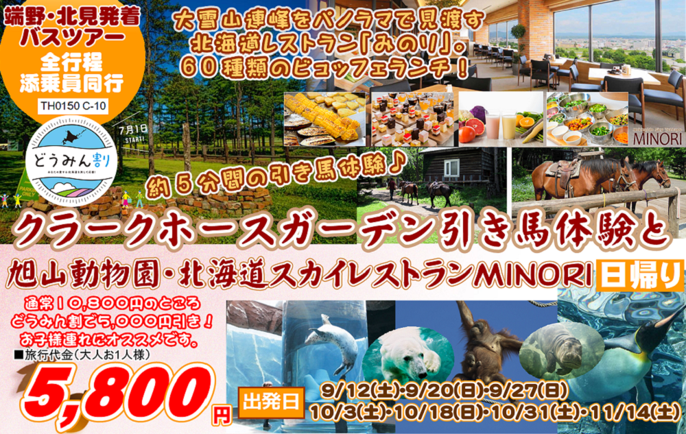 10月3日(土)出発クラークホースガーデン引き馬体験と旭山動物園・北海道スカイレストランMINORI日帰りバスツアーに参加しませんか?
