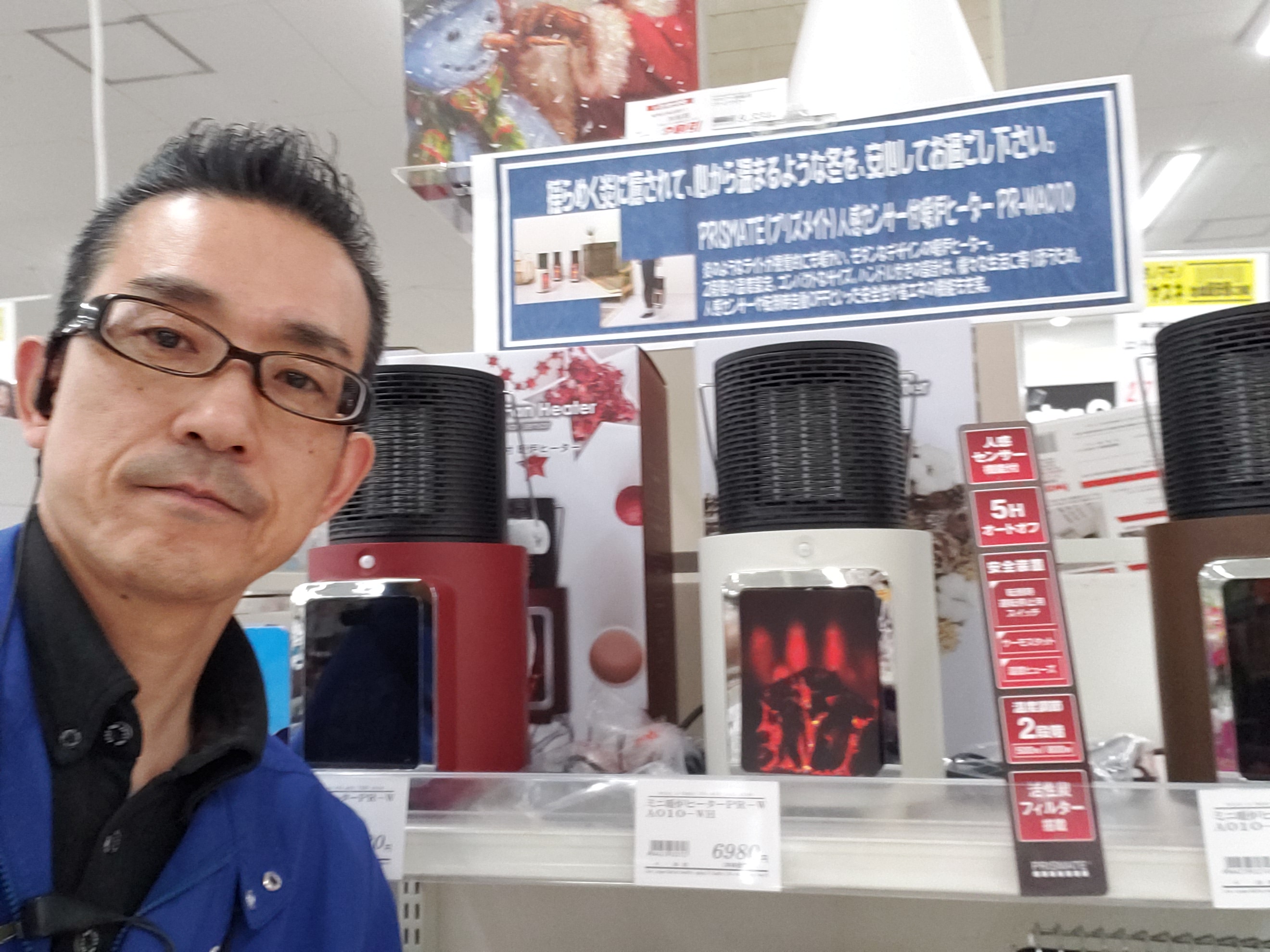 家電コーナーからは!おしゃれなミニ人感センサー付き暖炉ヒーターです。炎のライトが癒しや視覚的にも温かさを!人感センサーや転倒自動OFF機能付きで温かさ2段階切り替えです。カラーは3色 価格は6980円です。是非お買い求めくださいませ。