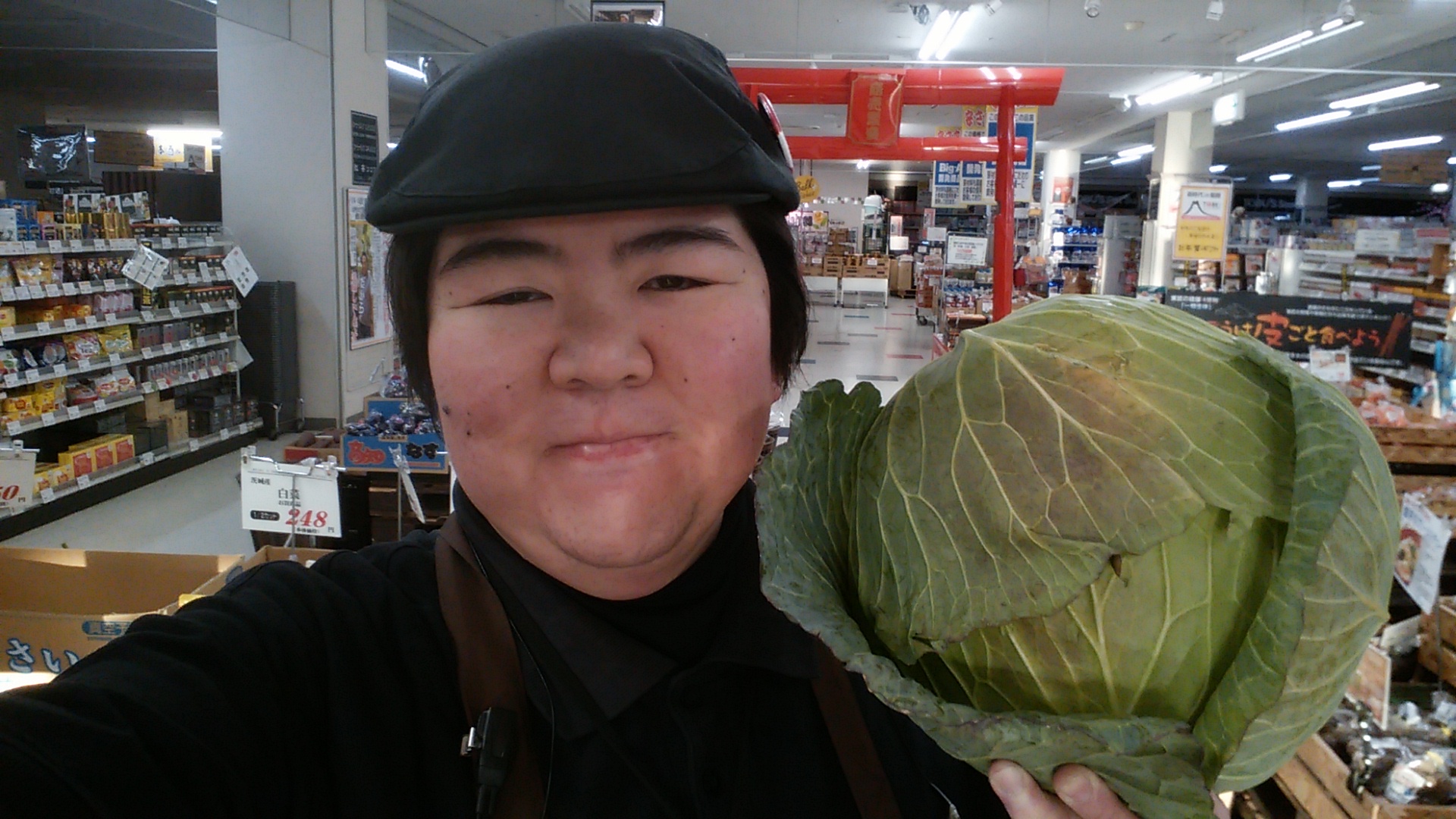 おはようございます。青果担当奥瀬です。本日は大玉サイズのキャベツがお買い得です。市場の年末の在庫だった為、お安く買い付けできました。茨城産 大玉キャベツ 1玉 99円です。オールマイティーに使えるキャベツ。是非ご利用ください。また、本日は月曜恒例の、野菜割引の日です。一部対象外の品もありますが、野菜ほとんど全品10%割引となっております。こちらも合わせてご利用ください。皆様のご来店をお待ちしております!