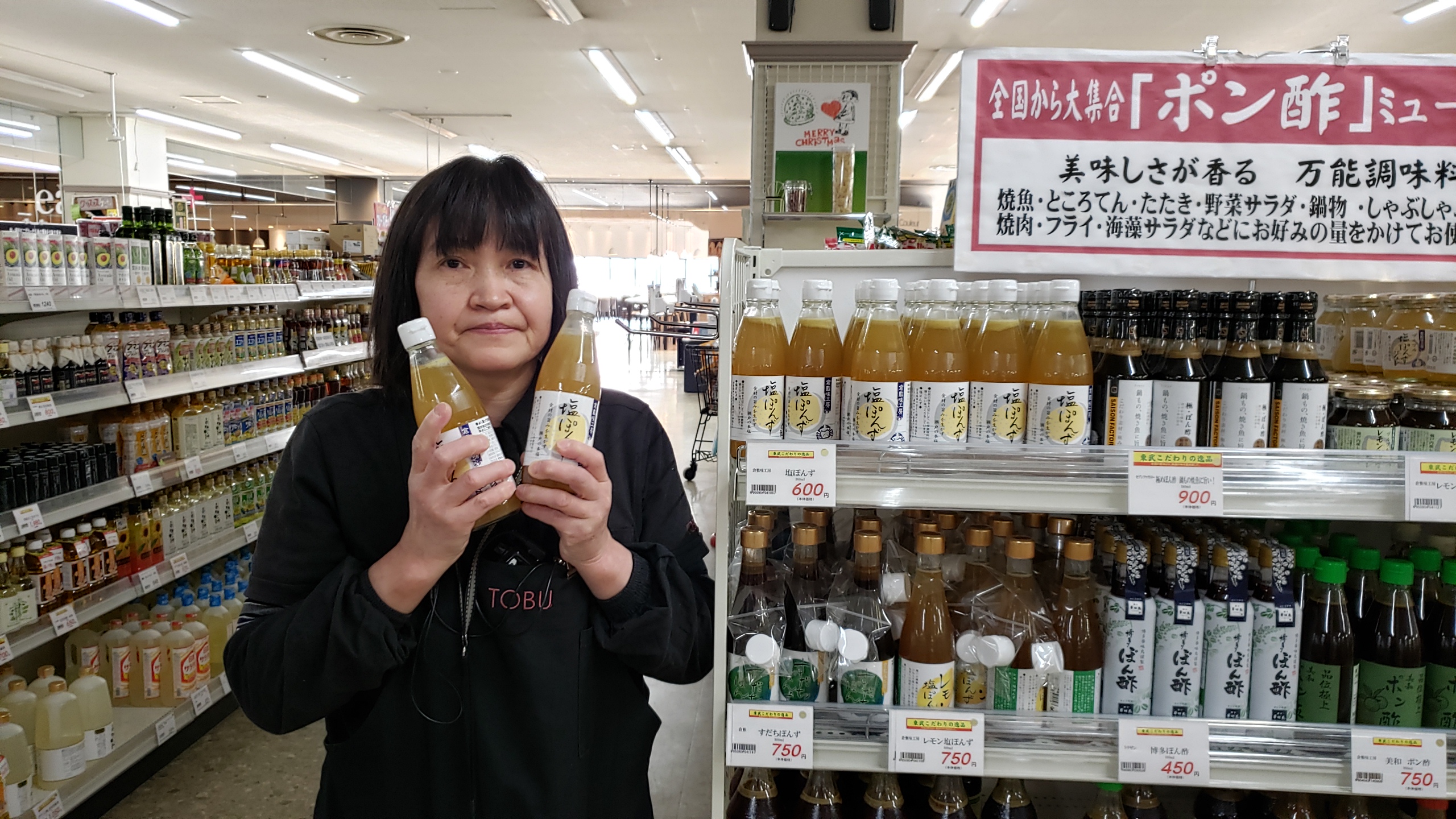 食品コーナーからは! 美味しさ香る万能調味料!ポン酢!倉敷市味工房 塩ぽんずです。食材の旨味を生かす瀬戸の本塩、後置のゆず、徳島のすだちをたっぷり使用した塩ぽんず!アレルゲン27品目なし!価格は360ml入りで600円です。是非お買い求めくださいませ。