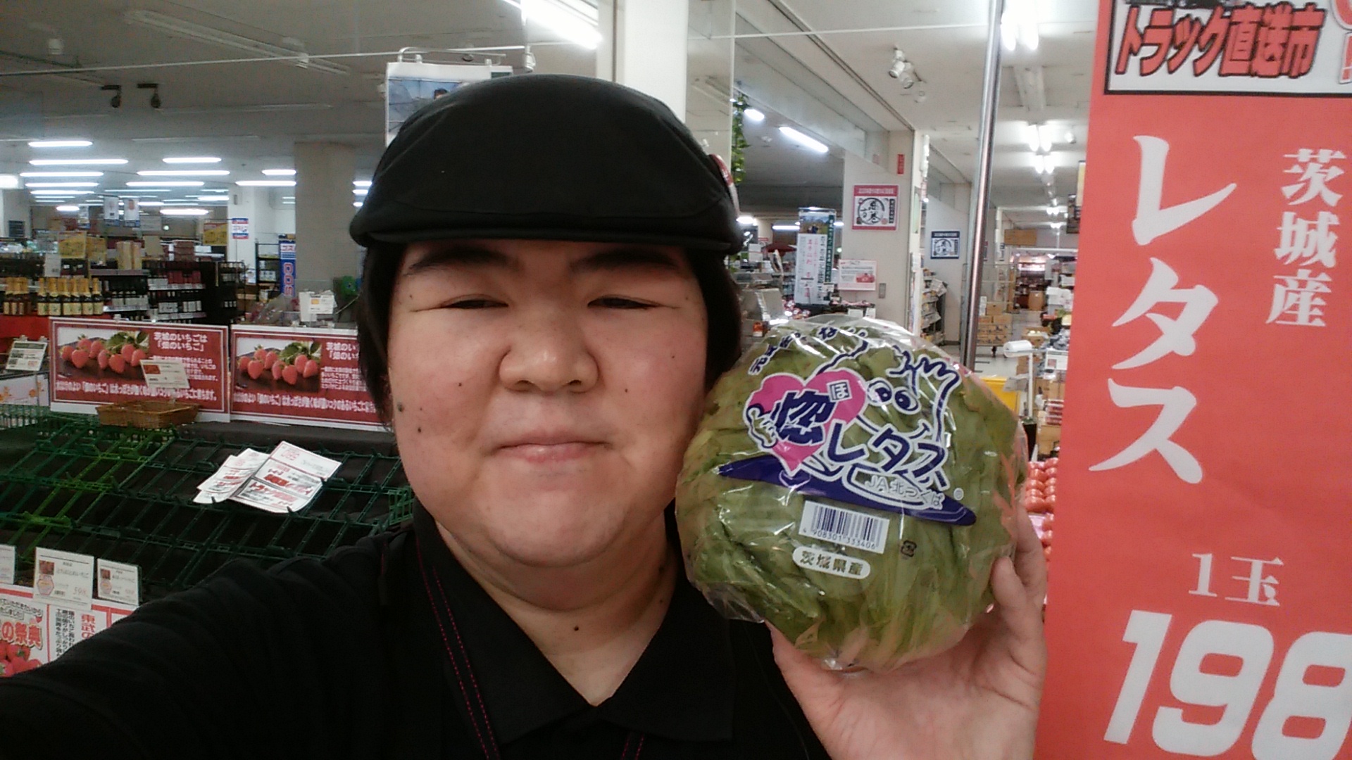 おはようございます。青果担当奥瀬です。本日は茨城直送セール開催します。茨城市場からトラックで直送の野菜、果物がお買い得です。茨城産レタス(Lサイズ) 1玉 198円となっております。その他、茨城直送セールならではの商品もありますので、是非ご利用ください。皆様のご来店をお待ちしております!