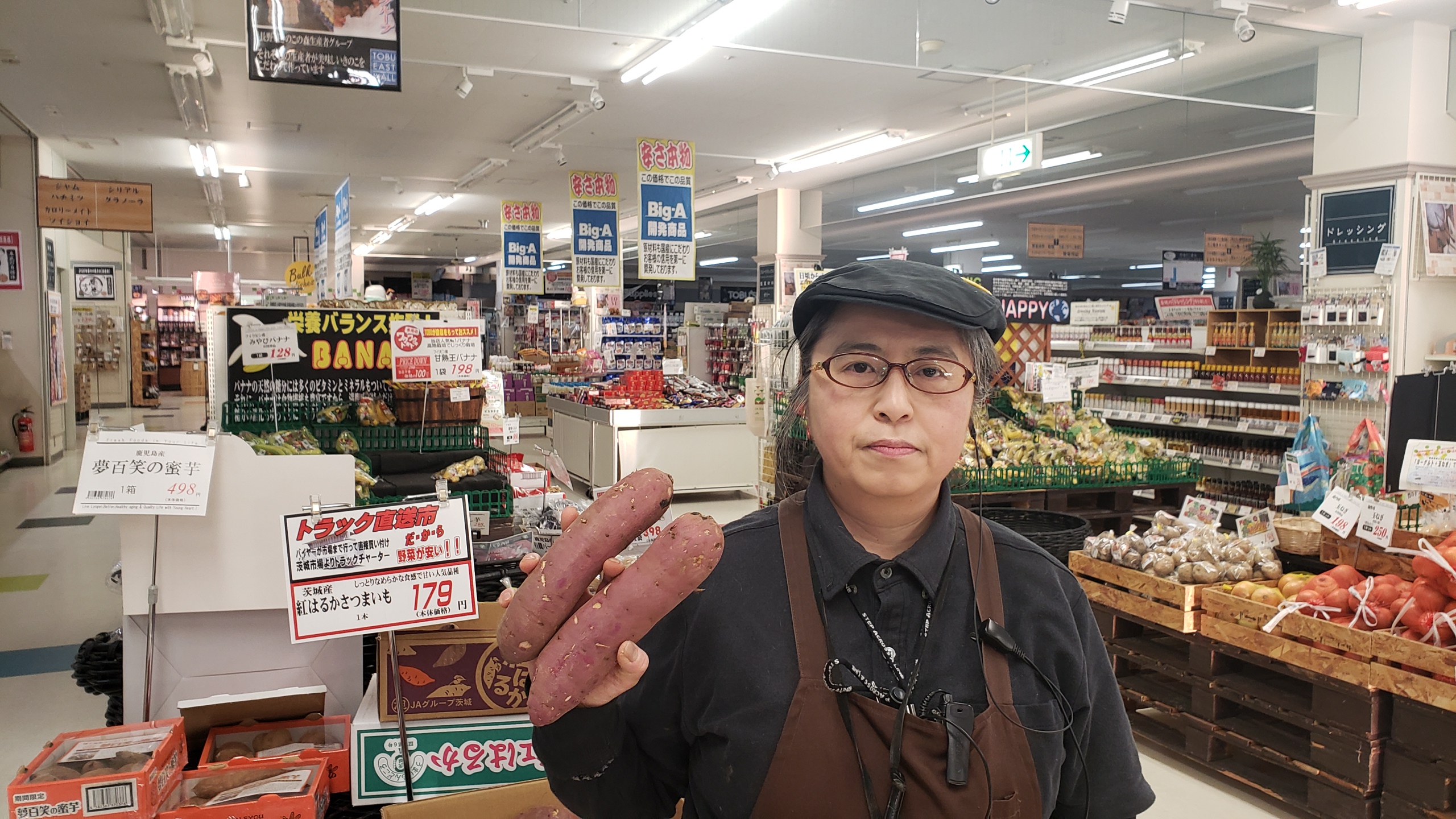 青果コーナーのオススメ!茨城産紅はるかがお買得です。秋に、収穫したさつまいもは、キァリング貯蔵され今から美味しくなります。焼き芋にするとしっとりなめらかな食感が楽しめます