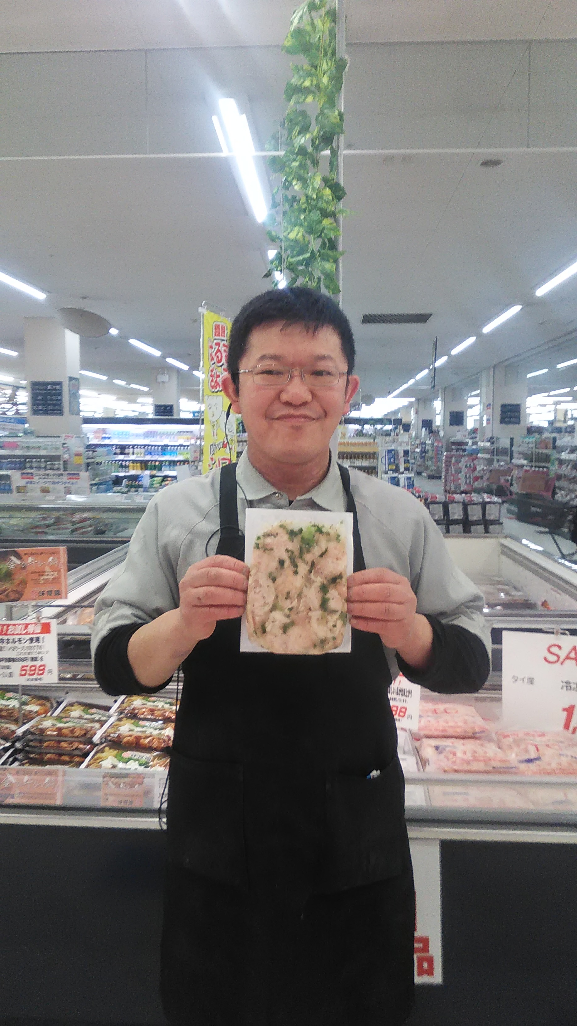 おはようございます。ミート担当近藤です。ジューシーなお肉とさっぱりとしたねぎ塩たれで美味しい品が出来上がりです。1羽から、少ししかとれない貴重か部位『背肉』を使用しています。