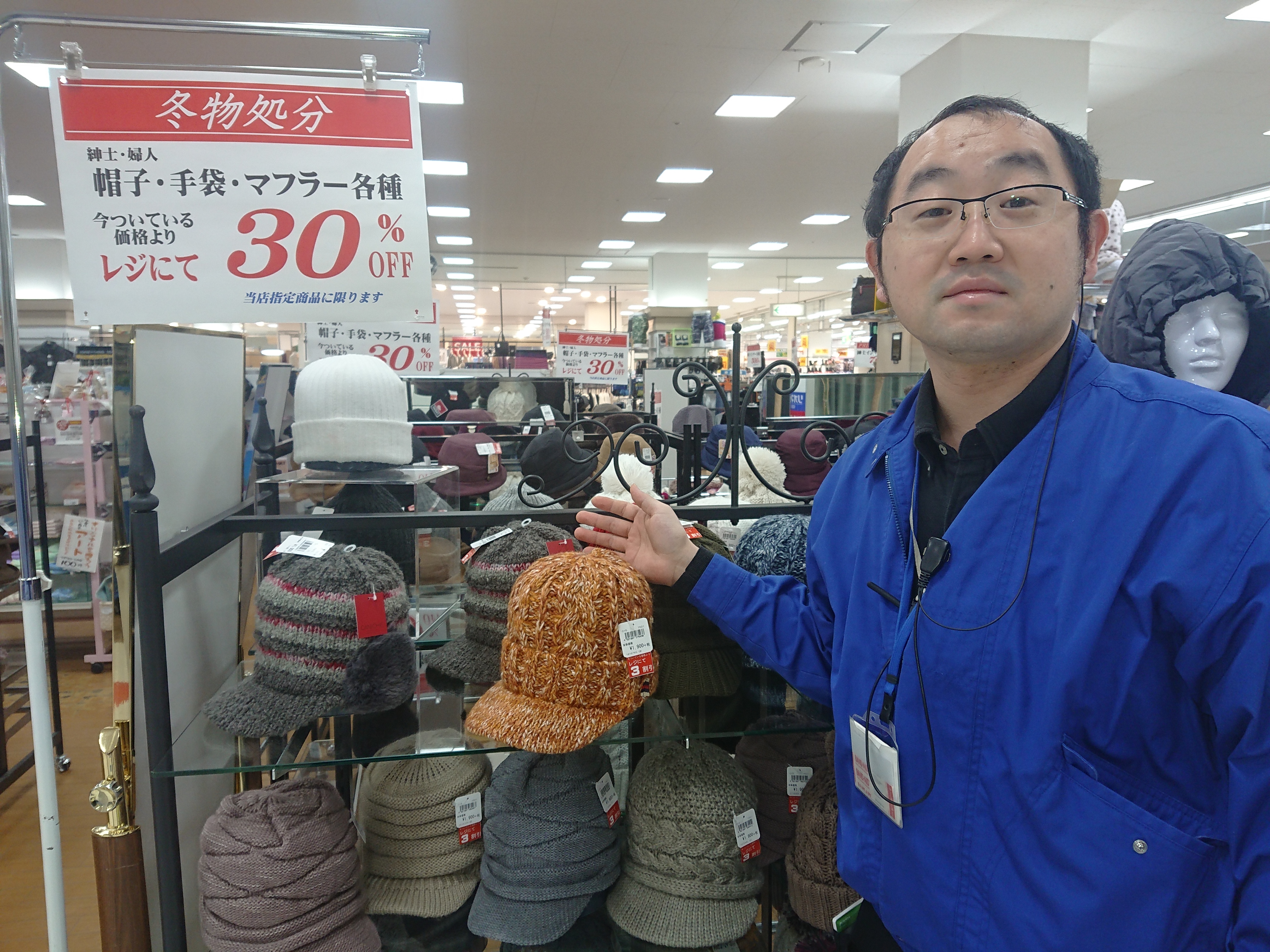 おはようございます、服飾担当 荒田です。北見市は本日雪が降り寒くなって来ましたね、帽子・手袋・マフラーが3割引とお買い得!風邪予防にも外出時は暖かくオシャレにお出かけ!