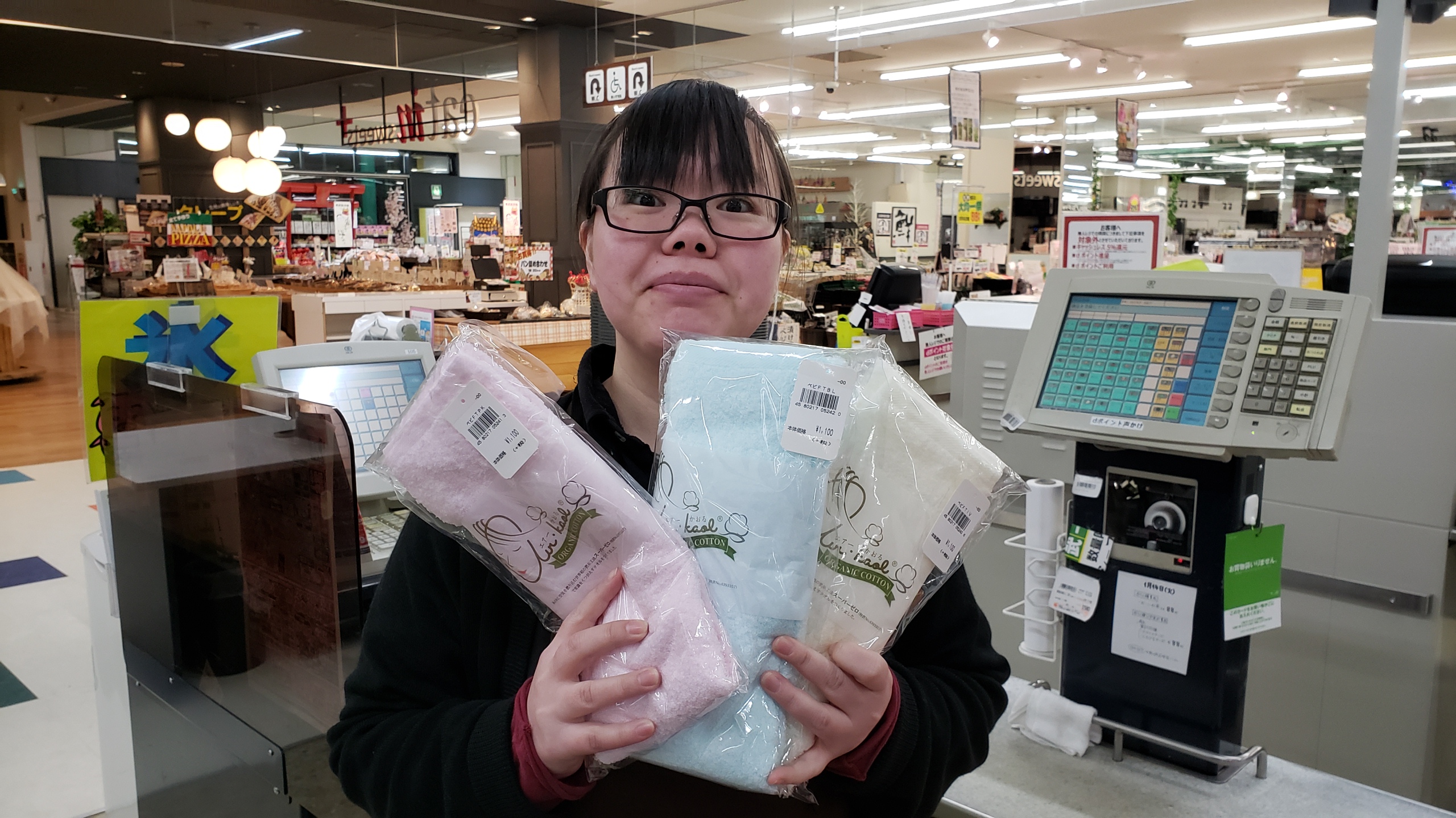 インテリアコーナーからは!おすすめ!魔法のタオル! エアーかおるベビマム フェイスタオルです!枯れ葉剤、除草剤、殺虫剤、化学肥料が一切使われずすべて(オーガニック畑となって10年)手摘みした繊維糸を使いパイル素材の、安心、安全な使い心地よく吸水にもすぐれたフェイスタオルに仕上げました。サイズは32cm×85cm 価格は1100円です。是非お買い求めくださいませ。