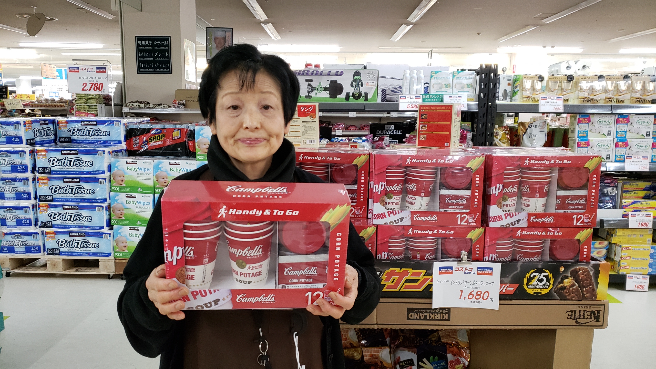 食品コーナーからは!コストコのキャンベル インスタントコーンポタージュスープ です。手軽に温かいスープを持ち運べるカップ付き!いつでも温かいスープが飲めますよ!12カップ入りで1680円です。是非お買い求めくださいませ。