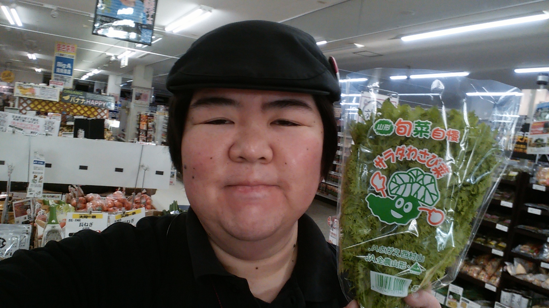 おはようございます。青果担当奥瀬です。本日はわさび菜のご紹介です。ピリッとした辛さが特徴です。浅漬け、おひたし、卵とじなどにいかがですか?リーフレタスの様に、サラダやサンドイッチにも使えます。山形産サラダわさび菜 1袋88円です。また、本日は毎週火曜水曜恒例の大均一祭を開催します。様々な商品が均一価格に。是非ご来店、ご利用くださいませ。お待ちしております。