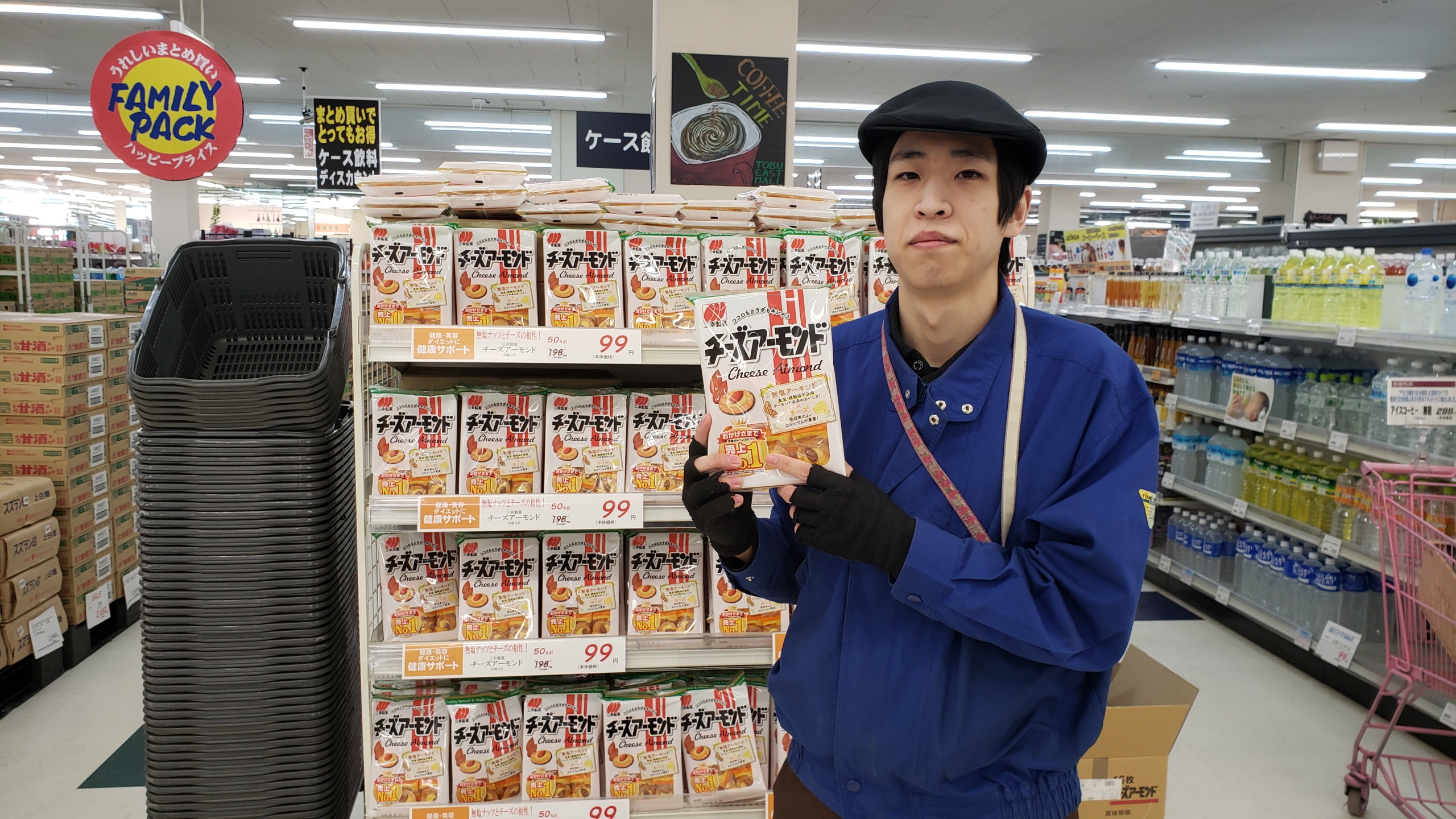 食品コーナーからは!人気の 三幸製菓 チーズアーモンドです。無塩アーモンド×チーズの相性抜群!美味しさ格別!価格は16枚入りで当店平常価格の半額 99円です。是非お買い求めくださいませ。