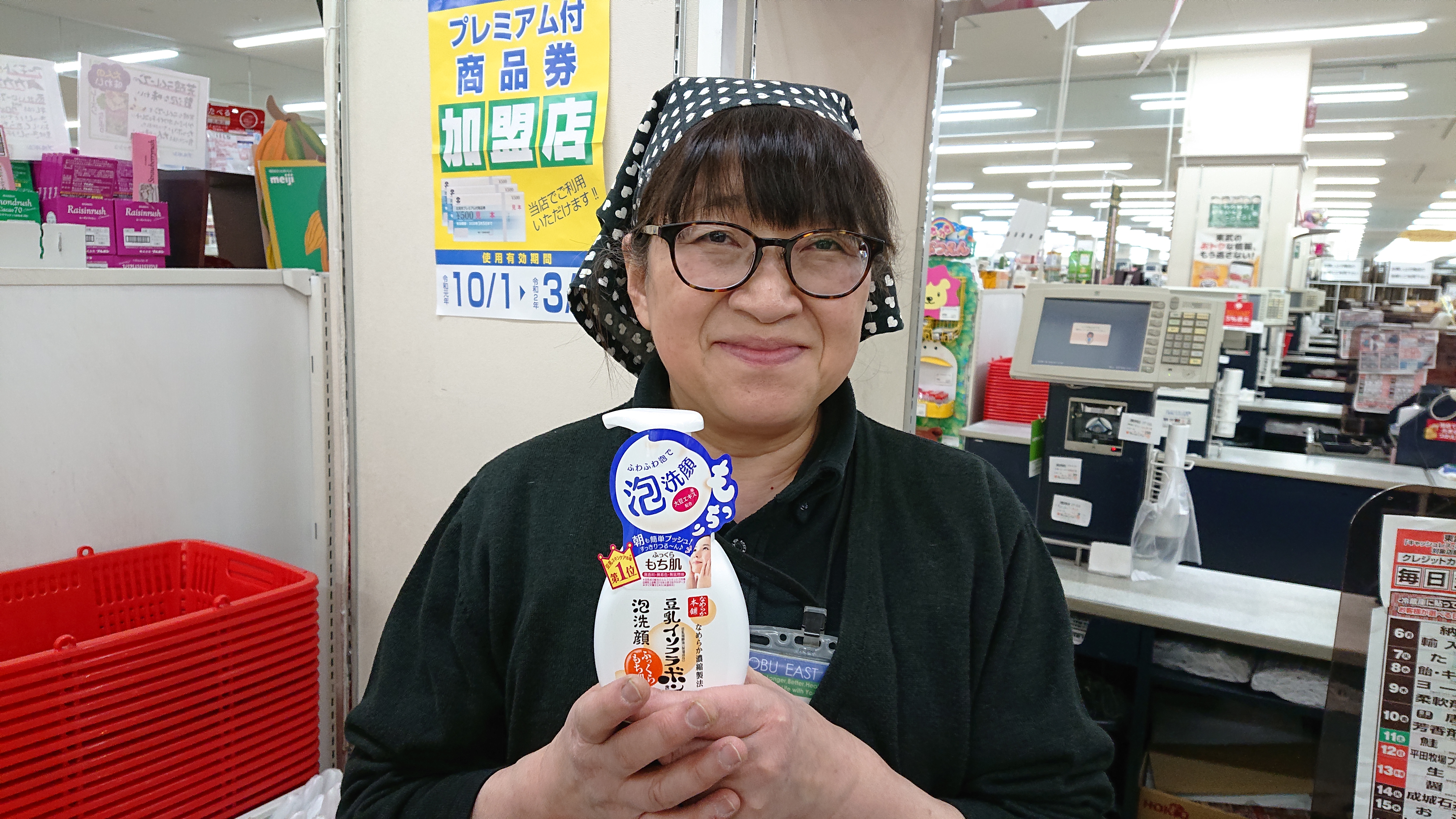 おはようございます。家庭消耗品担当小西です。本日のおすすめ商品は、豆乳イソフラボン泡洗顔です。泡洗顔でもっちりお肌になります。