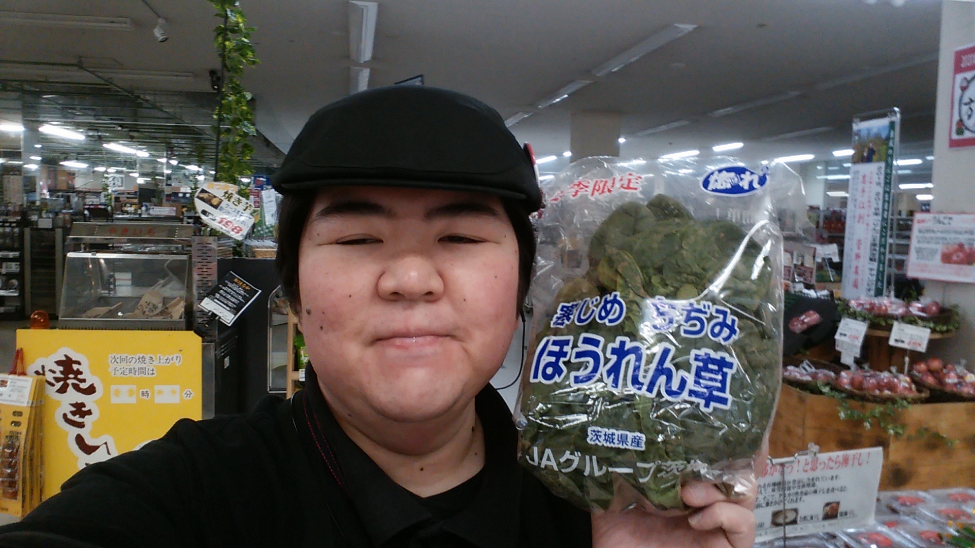 おはようございます。青果担当奥瀬です。本日、ちぢみほうれん草がお買い得です。寒さに当てて、葉が縮んだほうれん草。葉が肉厚で甘みが増したほうれん草です。おひたし、炒め物にいかがでしょうか。茨城産 ちぢみほうれん草 1袋 158円です。