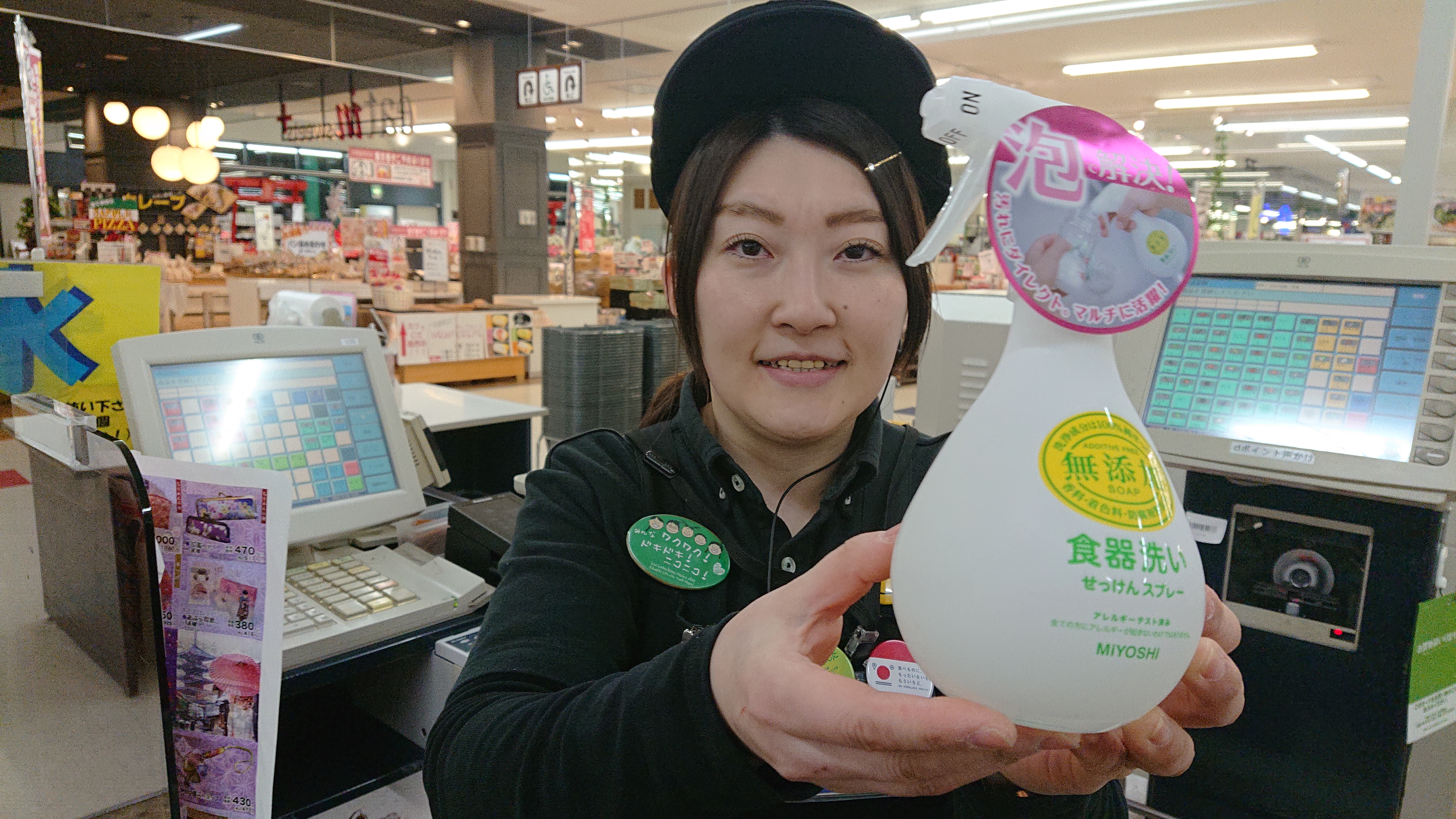 おはようございます。家庭消耗品担当小西です。本日のおすすめ商品は、ミヨシ食器洗いスプレーです。無添加なので安心商品です。