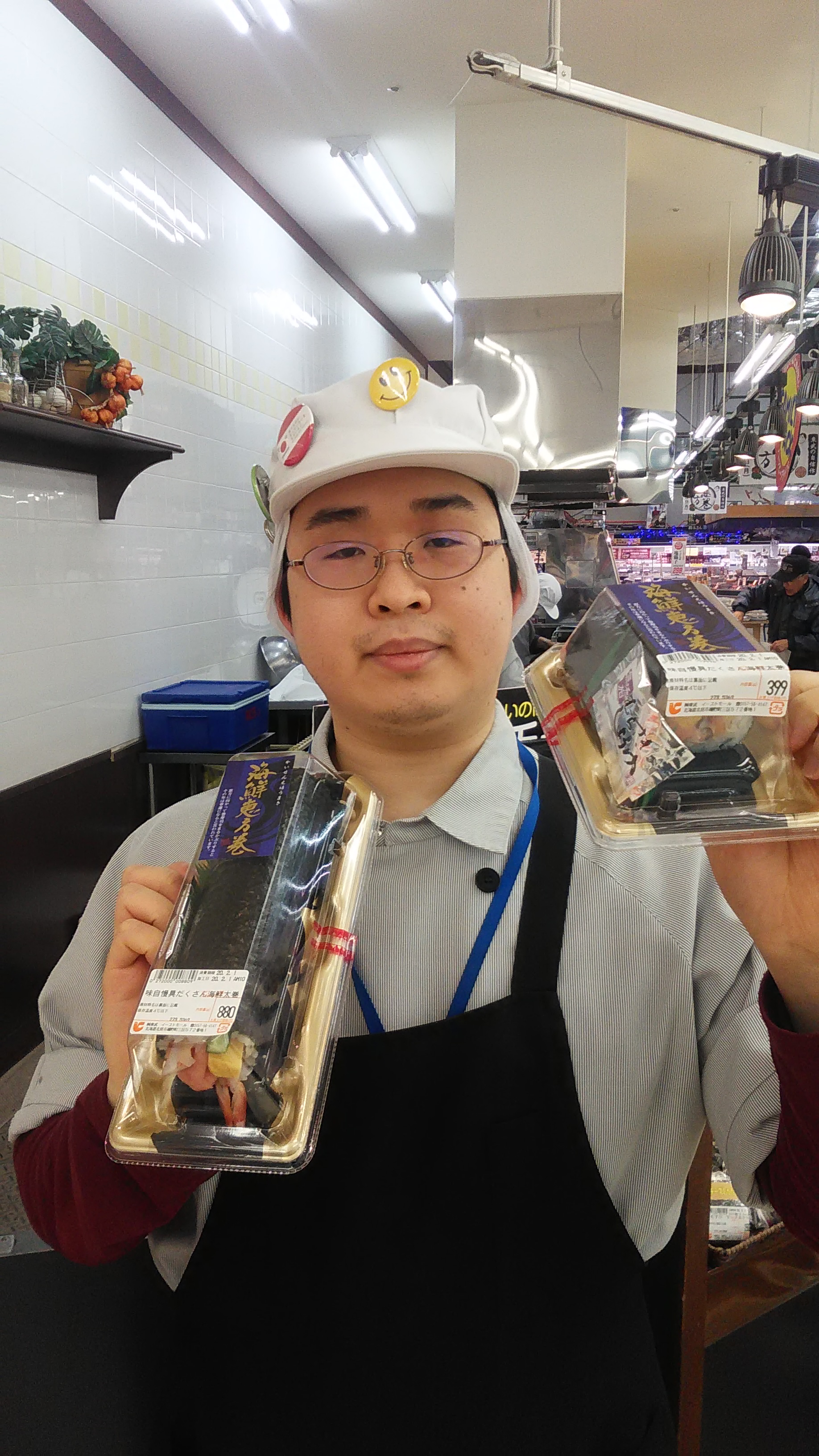 おはようございます。惣菜担当小川です 。本日は二月三日節分の日です。今年の方角は西南西です。写真に掲載してるのは海鮮恵方巻で恵方に向かって巻き寿司をまるかぶりするとその年は幸運になると言われています。他にも海鮮福巻きや鬼に金棒等あります。