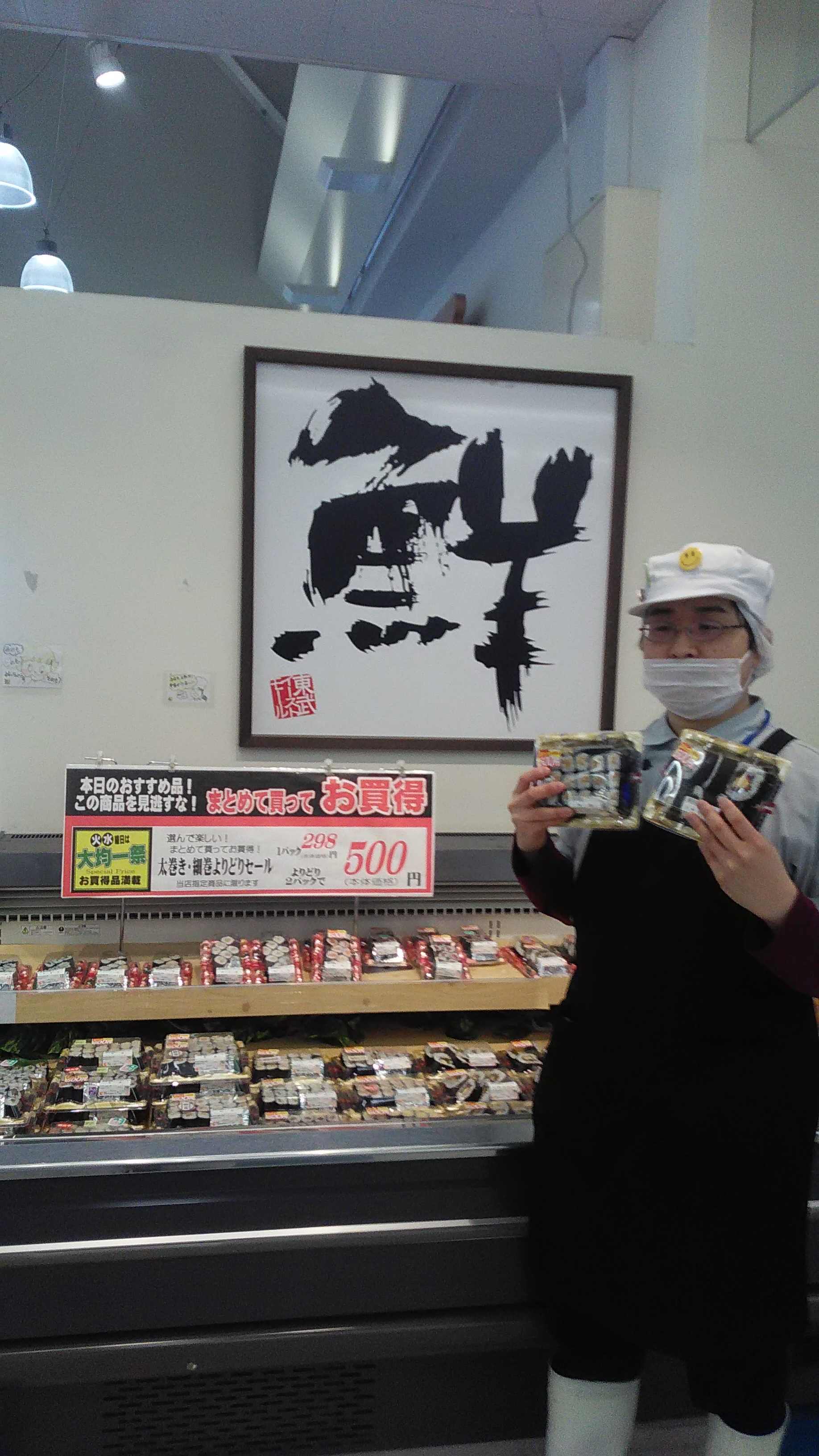おはようございます。惣菜担当小川です。太巻きカット、たまご細巻き、胡瓜細巻き、かんぴょう細巻き、納豆細巻き、ツナ細巻き、しんこ細巻き、明太子細巻き・ツナ細巻き・しんこ細巻きセット、サラダ巻き(ヒレカツ)、鉄火細巻き、サーモン細巻きがありまして各種1パック・298円(本体価格)、2パック・500円(本体価格)です。