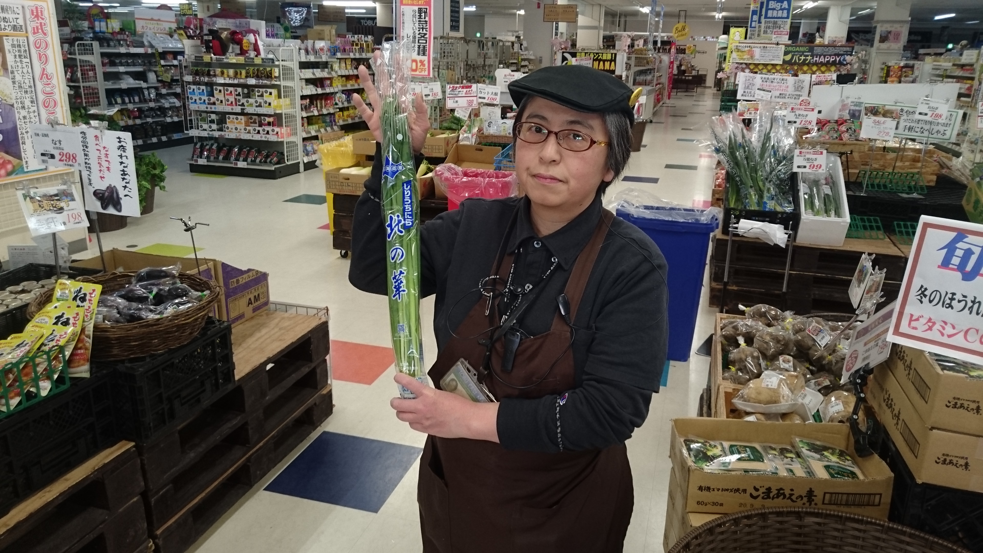 おはようございます。青果担当向中野です。本日のお買い得商品は知内産にら1袋99円です。新物なので柔らかく甘味があります