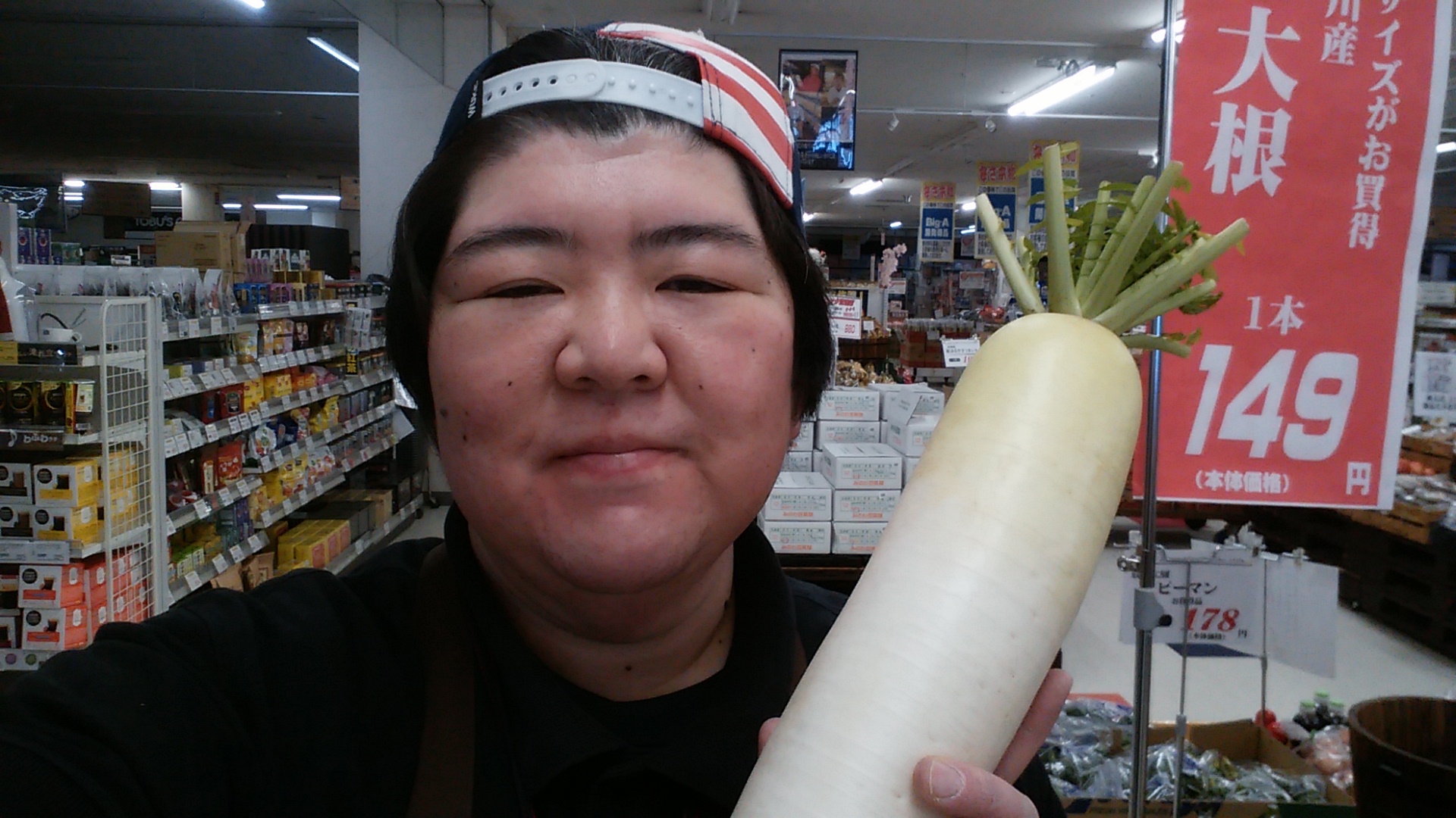 おはようございます。青果担当の奥瀬です。本日は大根がお買い得。神奈川産大根、1本149円です。煮物に、汁物に、大根おろしに、サラダにも。様々なメニューで丸々1本使い切りましょう。他にもお買い得商品多数取り揃えております。皆様のご来店をお待ちしております!
