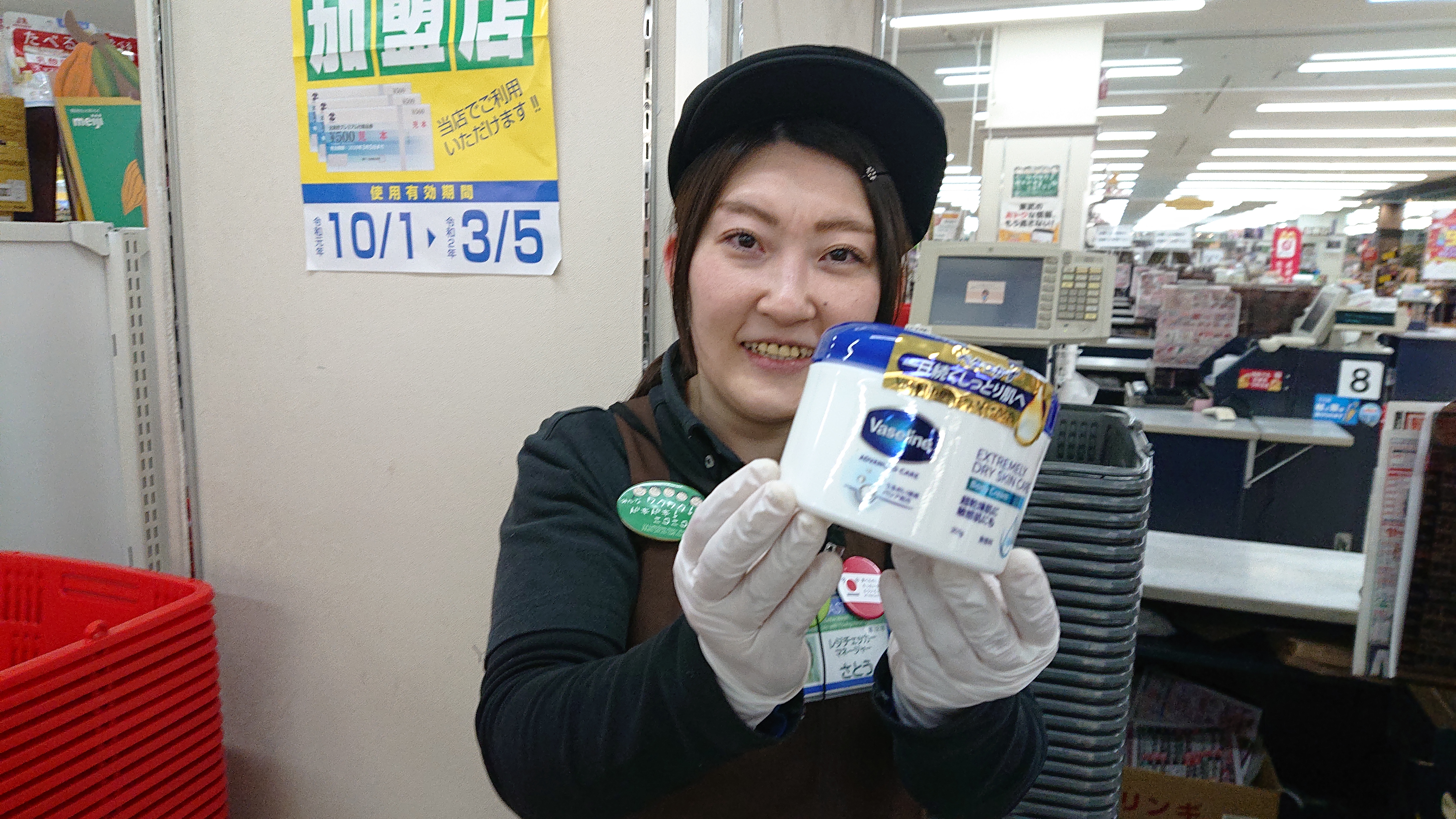 おはようございます。家庭消耗品担当小西です。本日のおすすめ商品は、ヴァセリンボディクリームです。乾燥肌の方におすすめです。