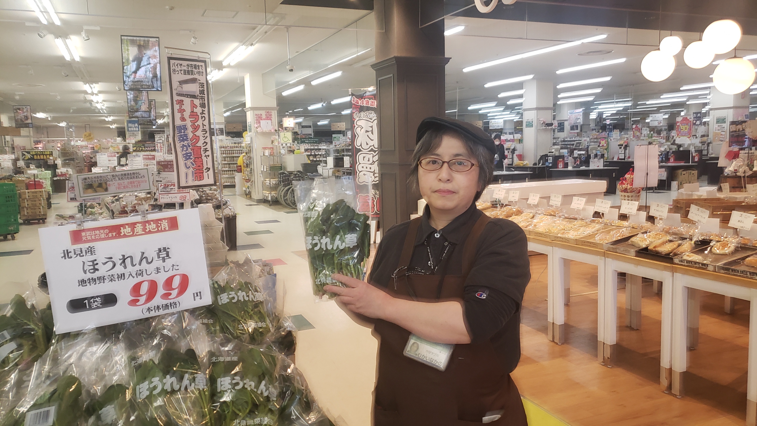 青果コーナーのオススメ!北見産ほうれん草が初入荷しました。1袋99円とお買得です。