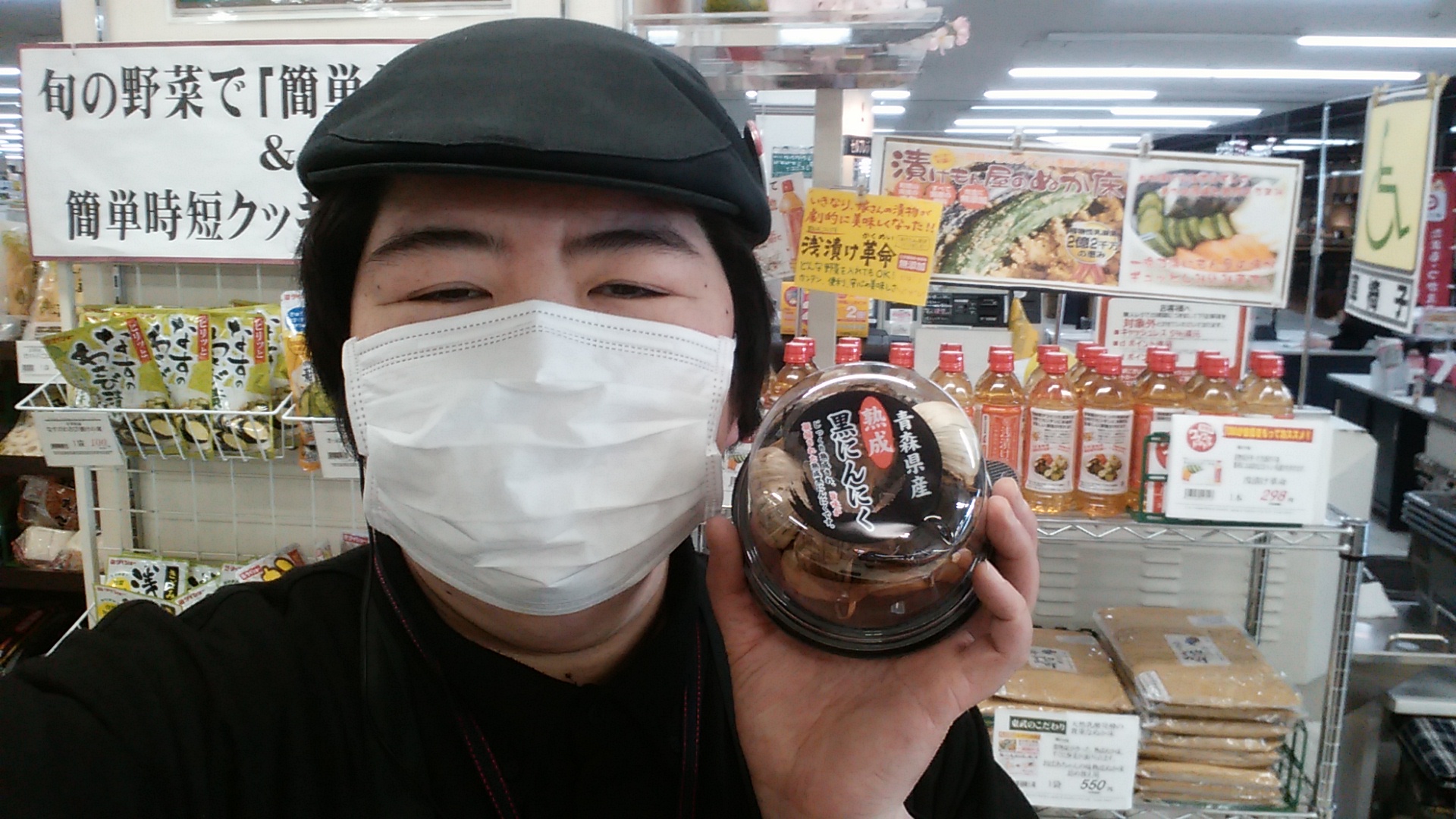 おはようございます。青果担当奥瀬です。本日は黒にんにくのご紹介です。じっくり熟成され、旨味が凝縮された黒にんにく。健康の為、1日1片~が目安です。あおもり産 熟成黒にんにく 150g1パック 1000円です。この他にもお買い得商品取り揃えております。皆様のご来店をお待ちしております!