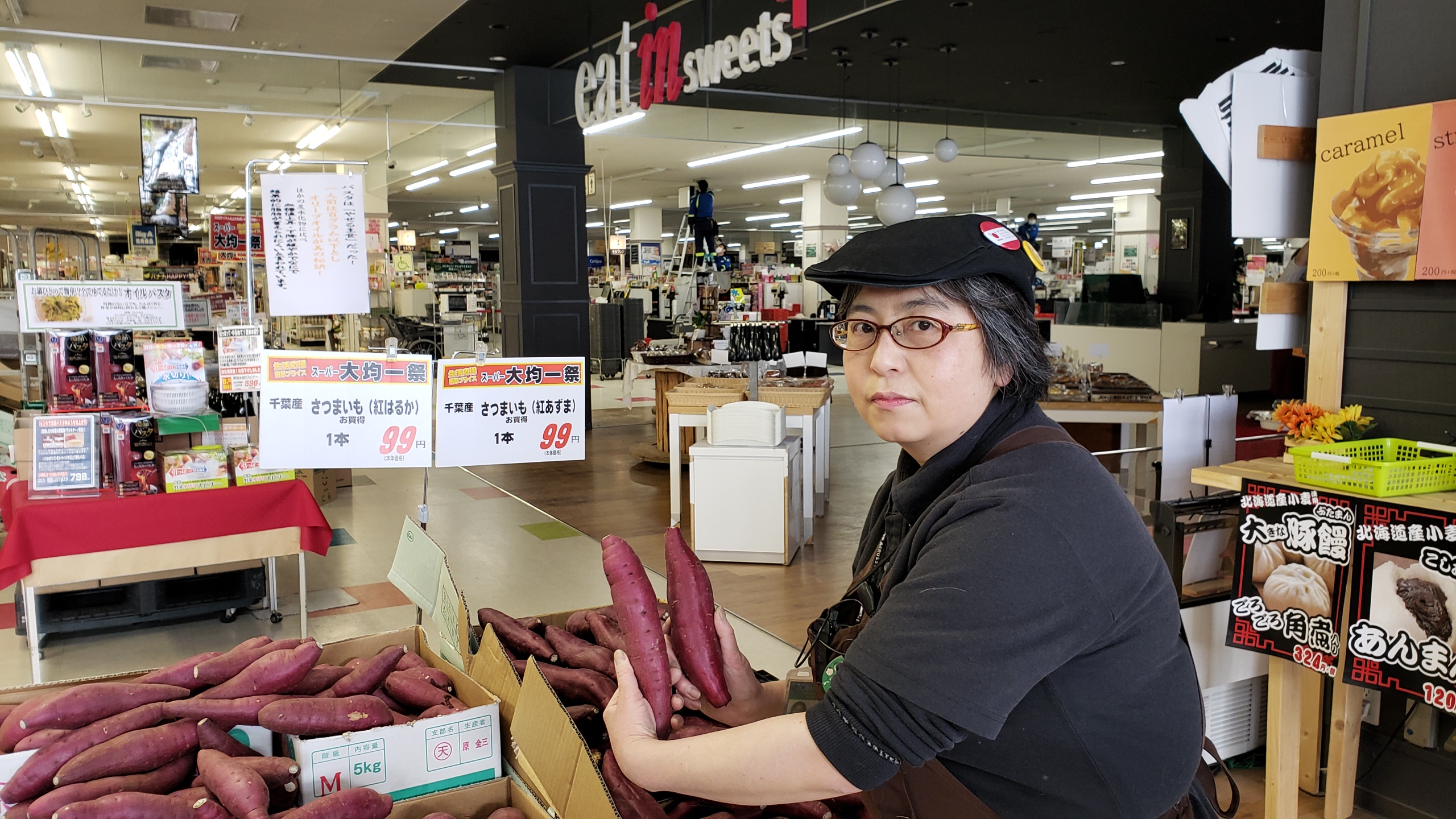 青果コーナーのオススメ!千葉産さつまいも。越冬貯蔵で、今が一番美味しくなってます。紅あずま、紅はるか各1本99円にて販売します