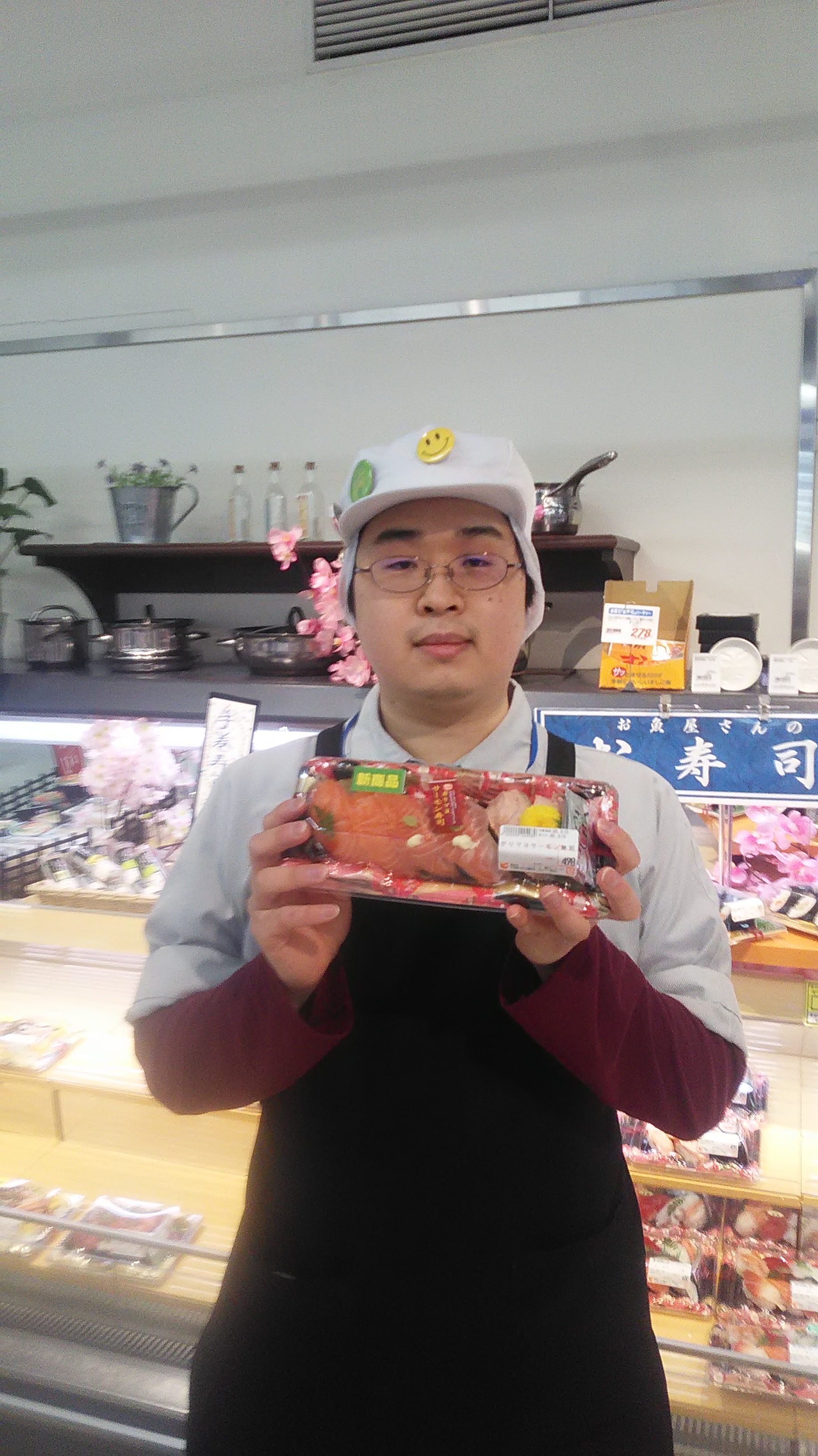 おはようございます。惣菜担当小川です。シャリの上にガリをのせて生サーモンをシャリの上にのせわさびてマヨネーズをトッヒング。この味やみつきになります。