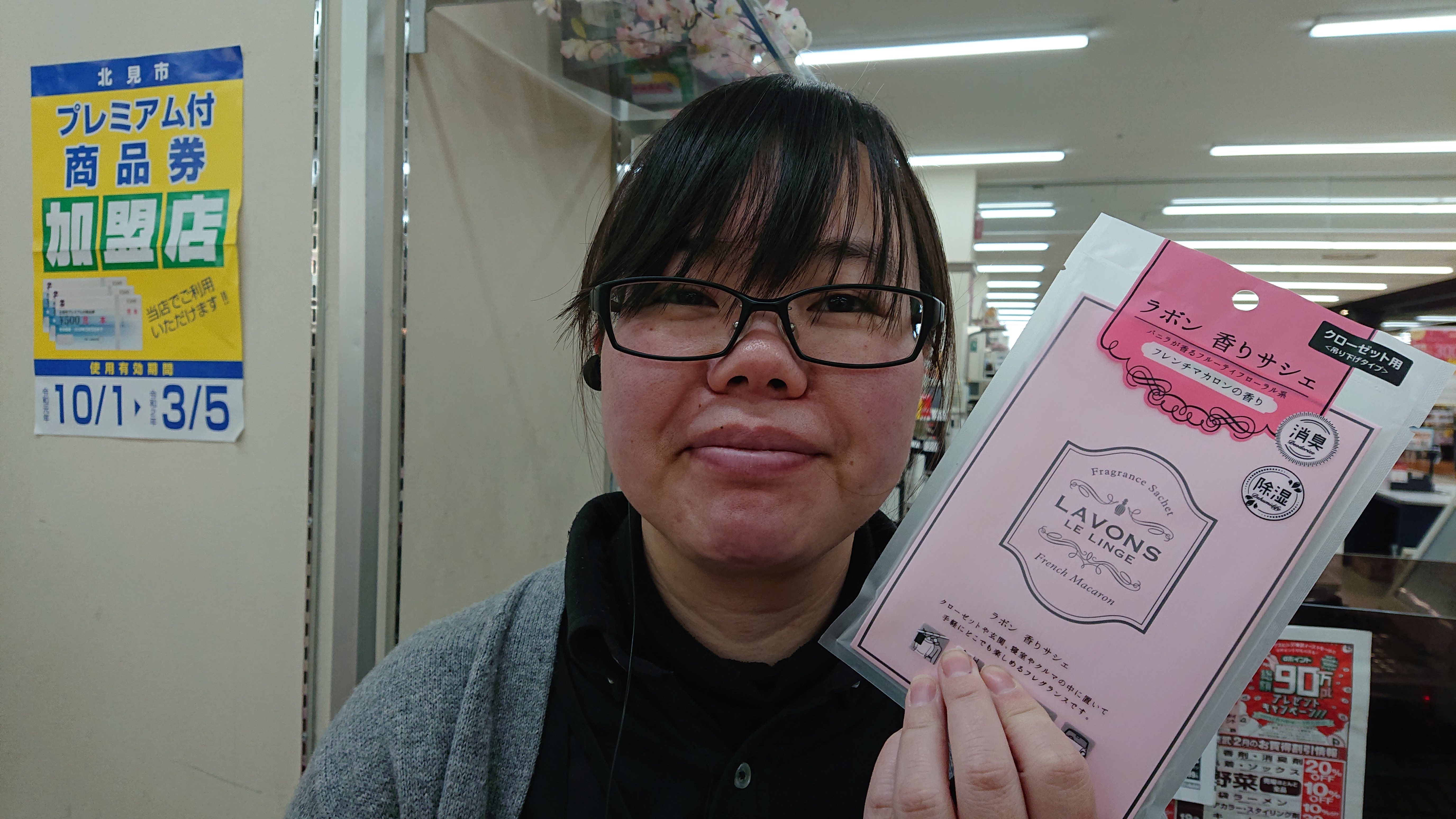 おはようございます。家庭消耗品担当小西です。本日のおすすめ商品は、ラボン香りサシエです。上品な香りが香るサシエおすすめです。