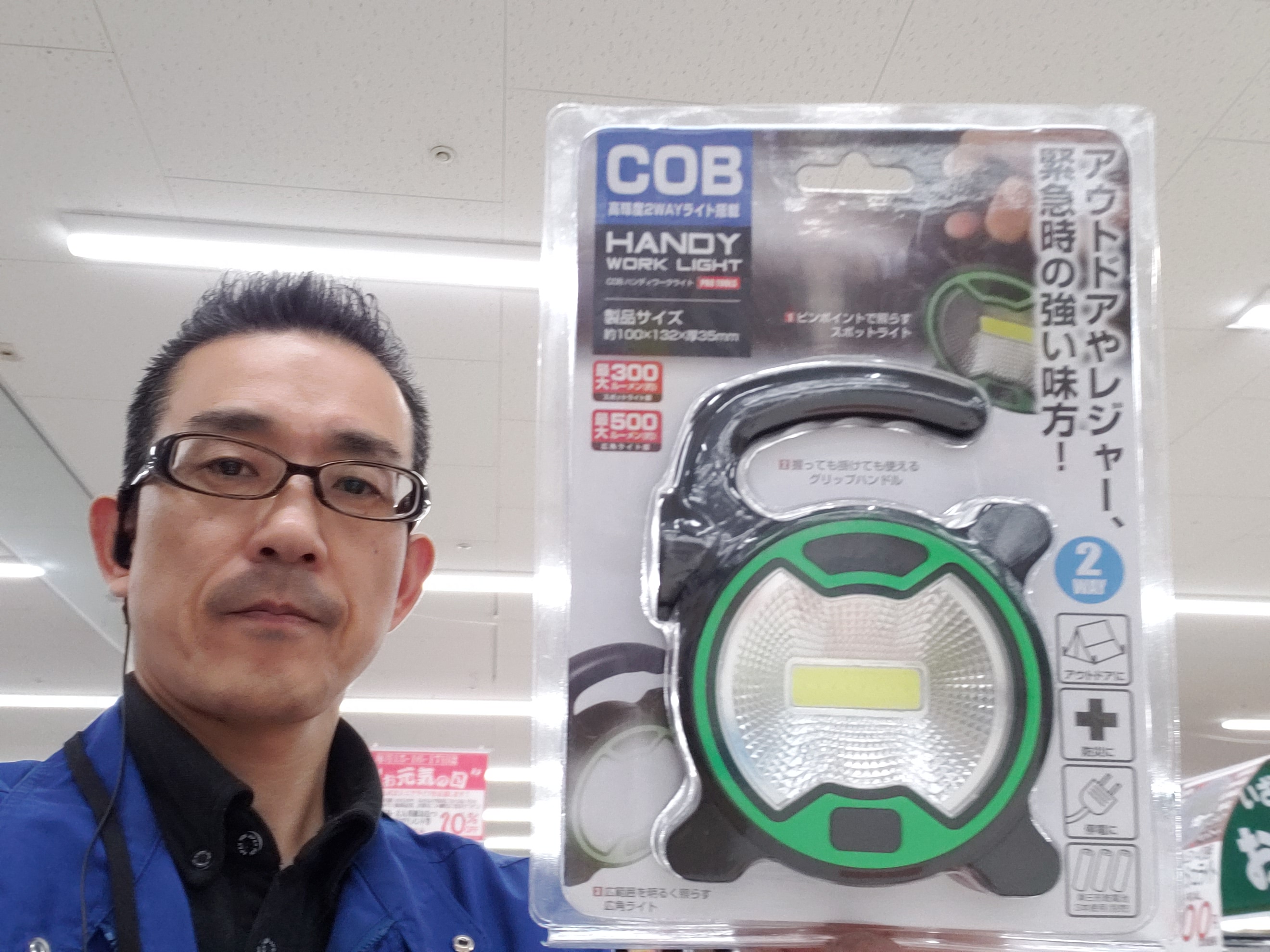 家電コーナーからはアウトドアから緊急事にも活躍!COB ハンディワークライトです。高輝度2WAYライト搭載。ピンポイントで照らすスポットライトあ付き!価格は598円です。是非お買い求めくださいませ。