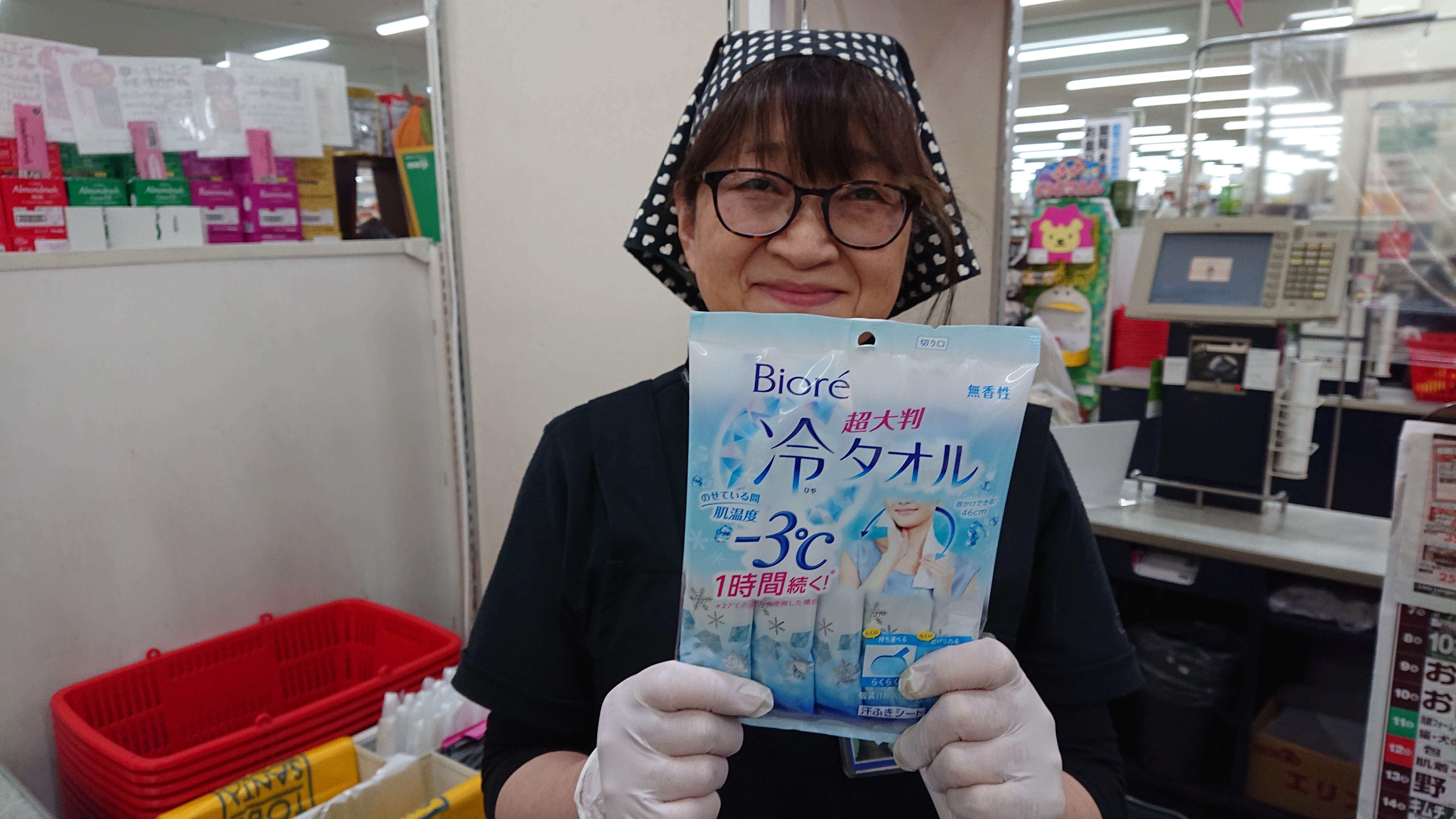 おはようございます。家庭消耗品担当小西です。本日のおすすめ商品は、ビオレ冷タオルです。これからの季節の必需品です。