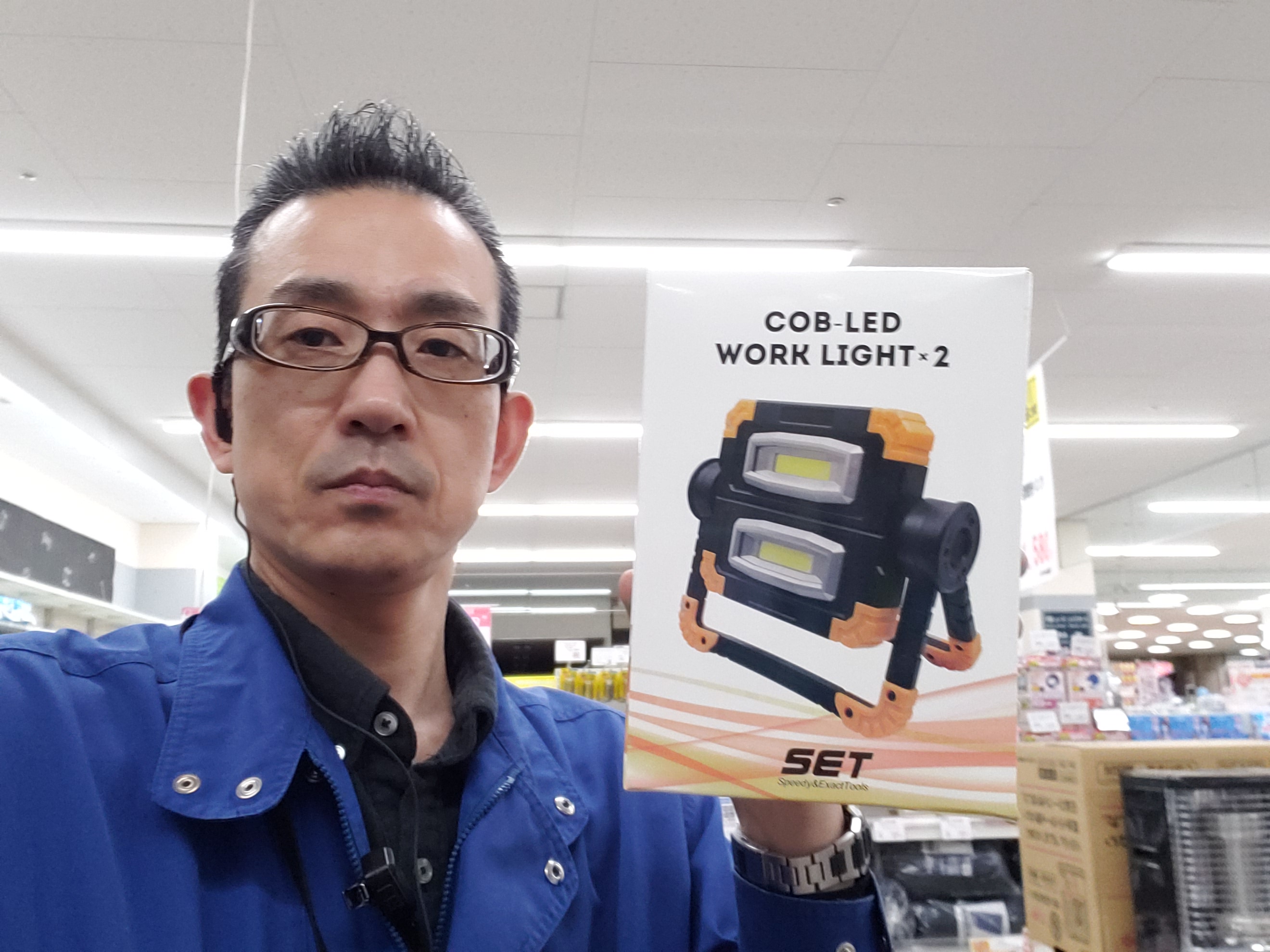 家庭コーナーからは!2つのLEDライトが明るさを照らします!360°回転するスタンドで好きな角度や使い方ができる!置き型、持ち型の2つの使い方ができる!ボタン一つで1灯2灯の切り替え!COB LED ワークライト×2 価格は1280円です。是非お買い求めくださいませ。