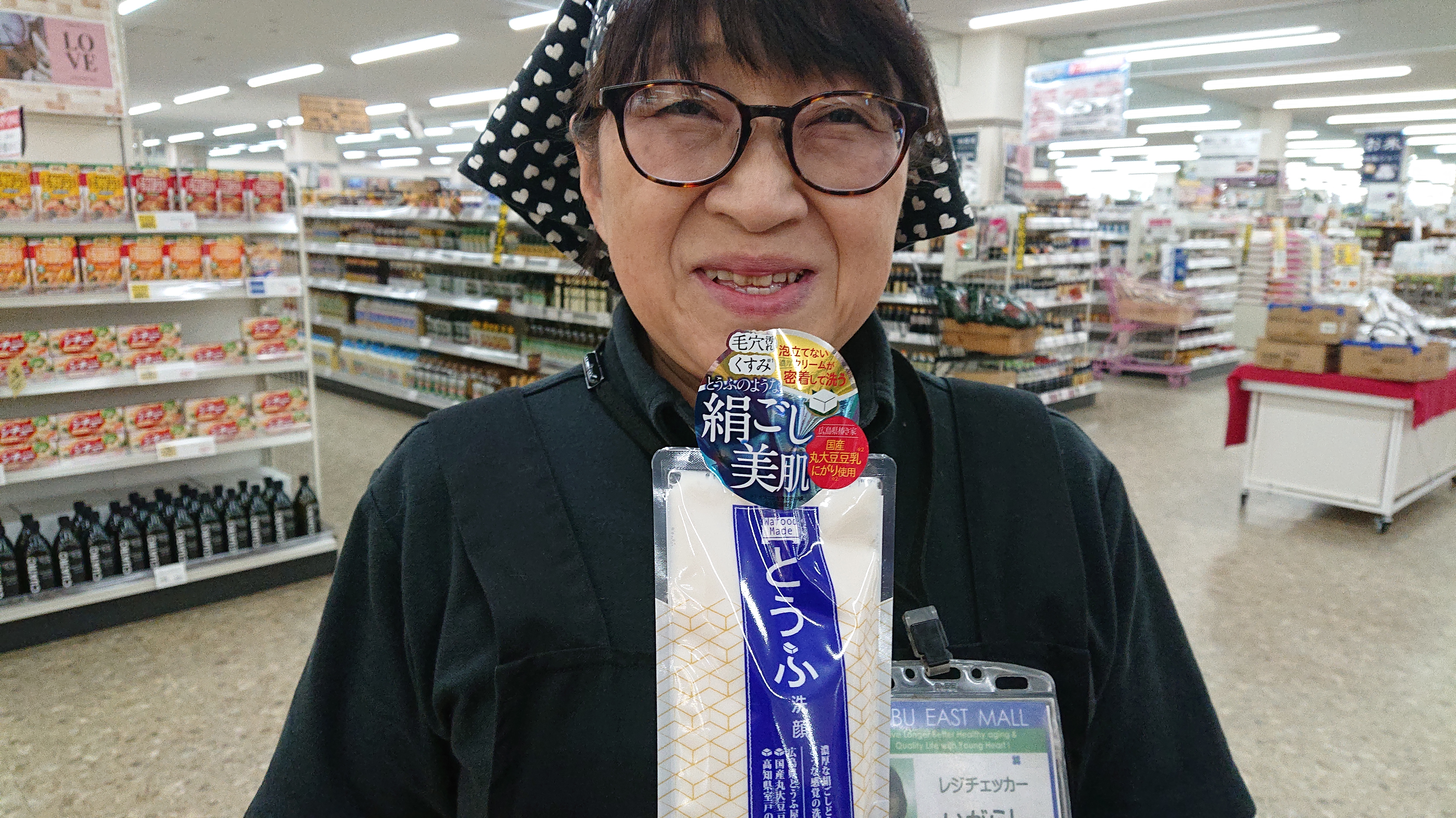 おはようございます。家庭消耗品担当小西です。本日のおすすめ商品は、豆腐石鹸です。イソフラボン効果でしっとりお肌になります。