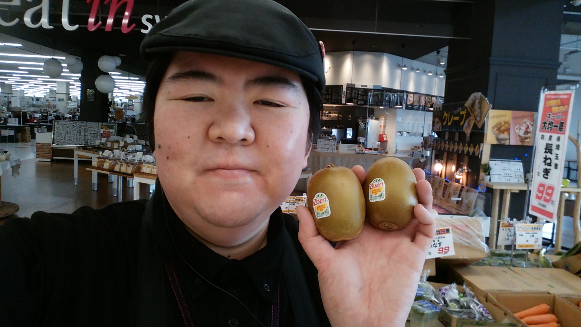 おはようございます。本日もスーパー大均一祭開催中です。果物コーナーからのオススメは、ニュージーランド産、サンゴールドキウイ。1玉99円です。是非ご利用くださいませ。