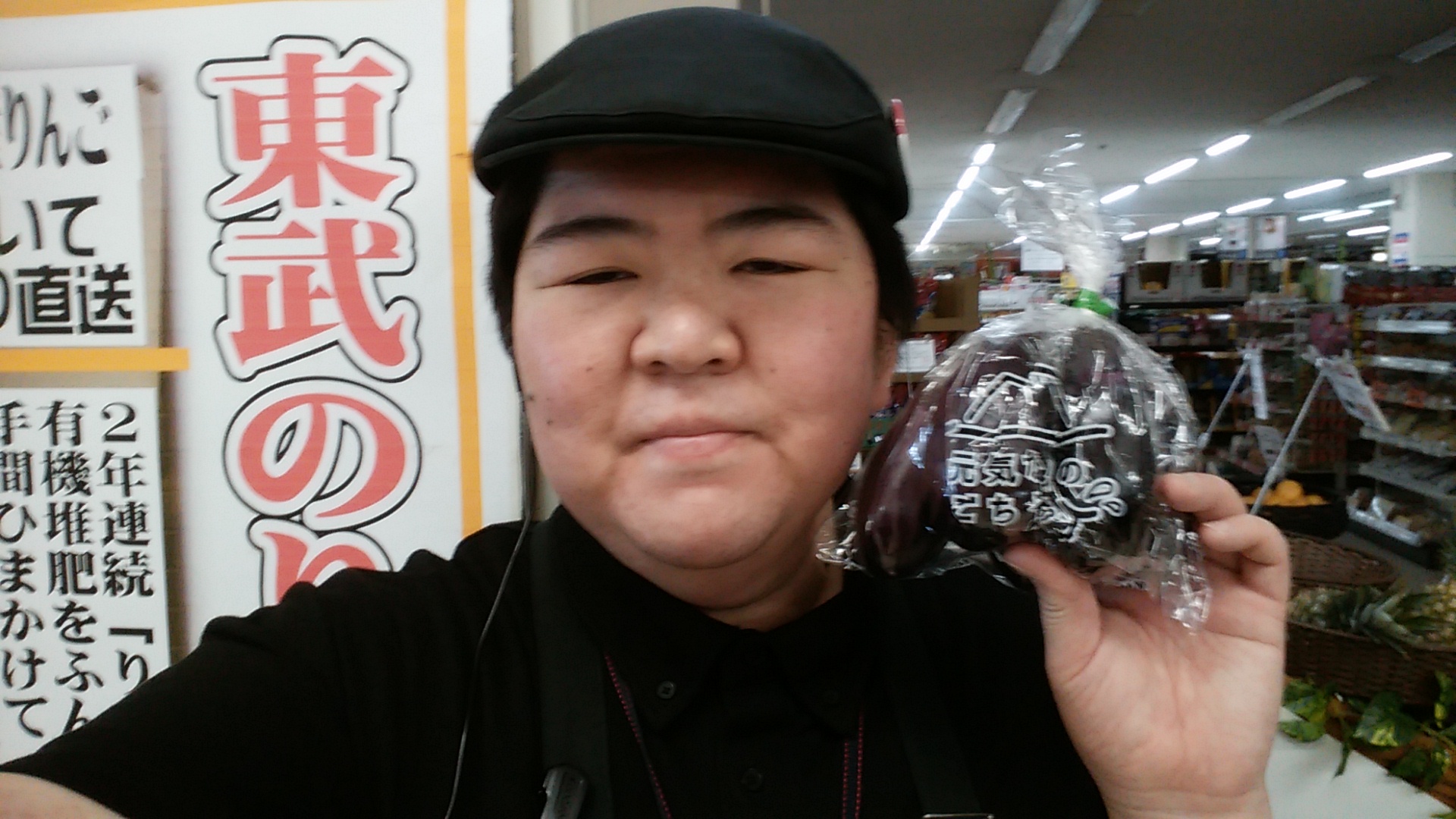 おはようございます。本日スーパー大均一祭です。均一価格は勿論、それ以外にもお買い得商品取り揃えております。高知産なす5本入1袋199円です。是非ご利用ください。