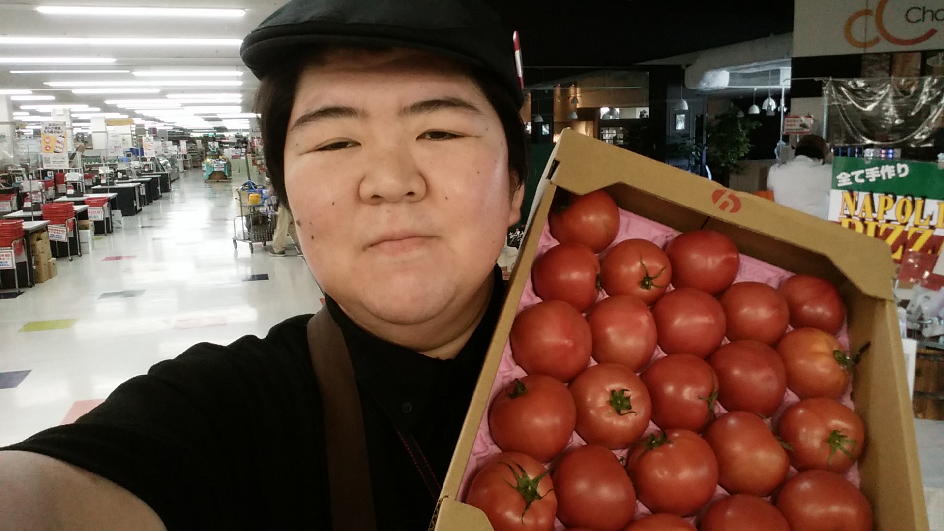 おはようございます。青果担当奥瀬です。本日は毎月恒例の一の市です。青果コーナーでも、お買い得商品を取り揃えております。熊本産とまと約4kg入り、1箱990円です。その他にもお買い得商品ご用意しております。是非ご利用くださいませ。