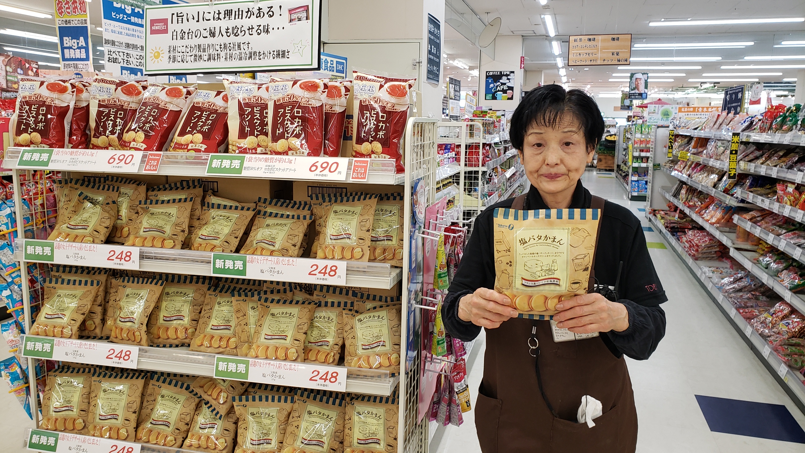 食品コーナーからは!話題の女子デザートが入荷しました!宝製菓 塩ばたかまん フランス産ロレーヌ岩塩使用 の塩バタークッキーにカマンベールチーズをサンド! 価格は248円です。是非お買い求めくださいませ。