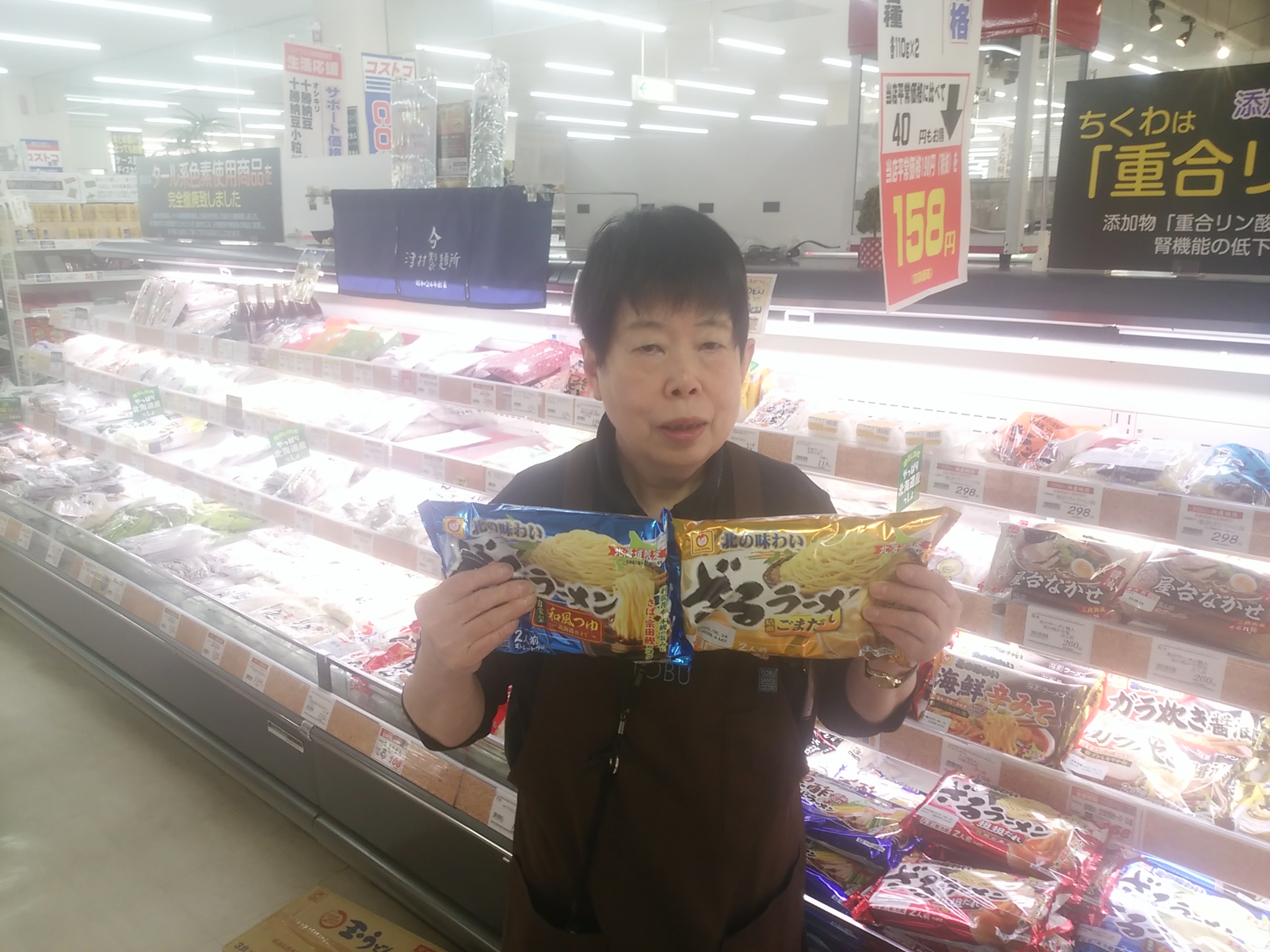 本日の食品コーナーからのオススメは、ザルラーメン。しっかりとしたコシをご堪能ください。2人前1袋168円です。