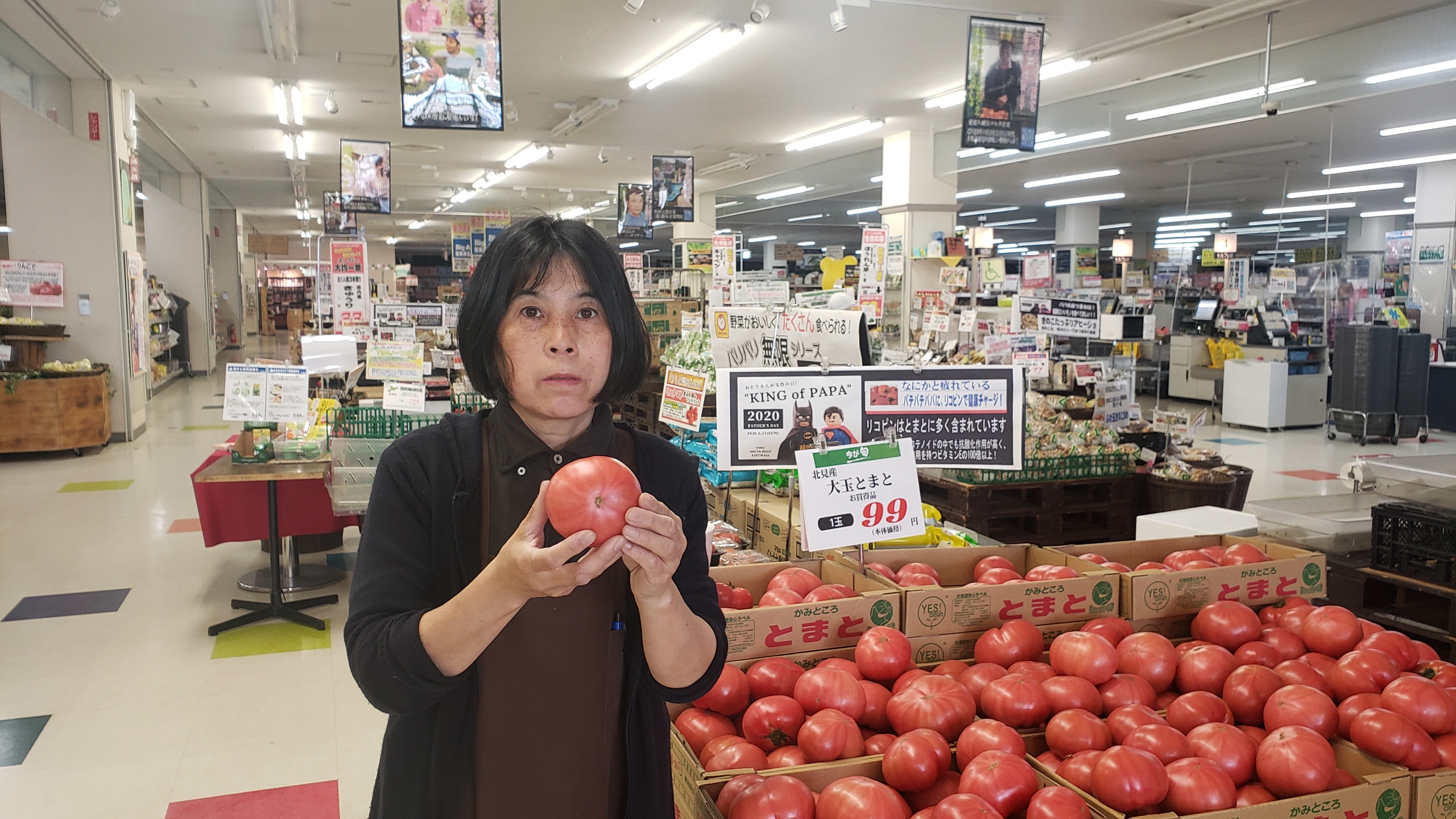 青果コーナーのオススメ!地元北見産とまとがお買得です。1玉99円にて販売します。出始めのとまとは、甘く果肉もしっかりしてます