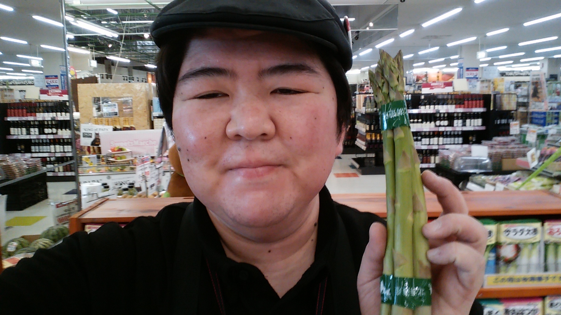 おはようございます。青果担当奥瀬です。本日は北海道産アスパラがお買い得です。1束150円。是非ご利用ください。