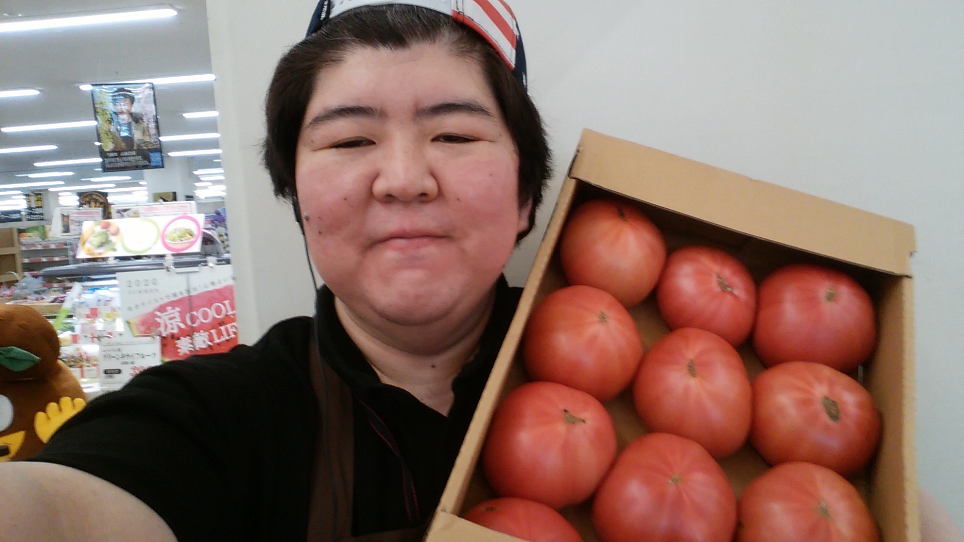 こんにちは。青果担当奥瀬です。本日はとまとがお買い得です。北海道産とまと 4kg入り1箱、1280円です。リコピンたっぷりのとまとはいかがですか?是非ご利用ください。