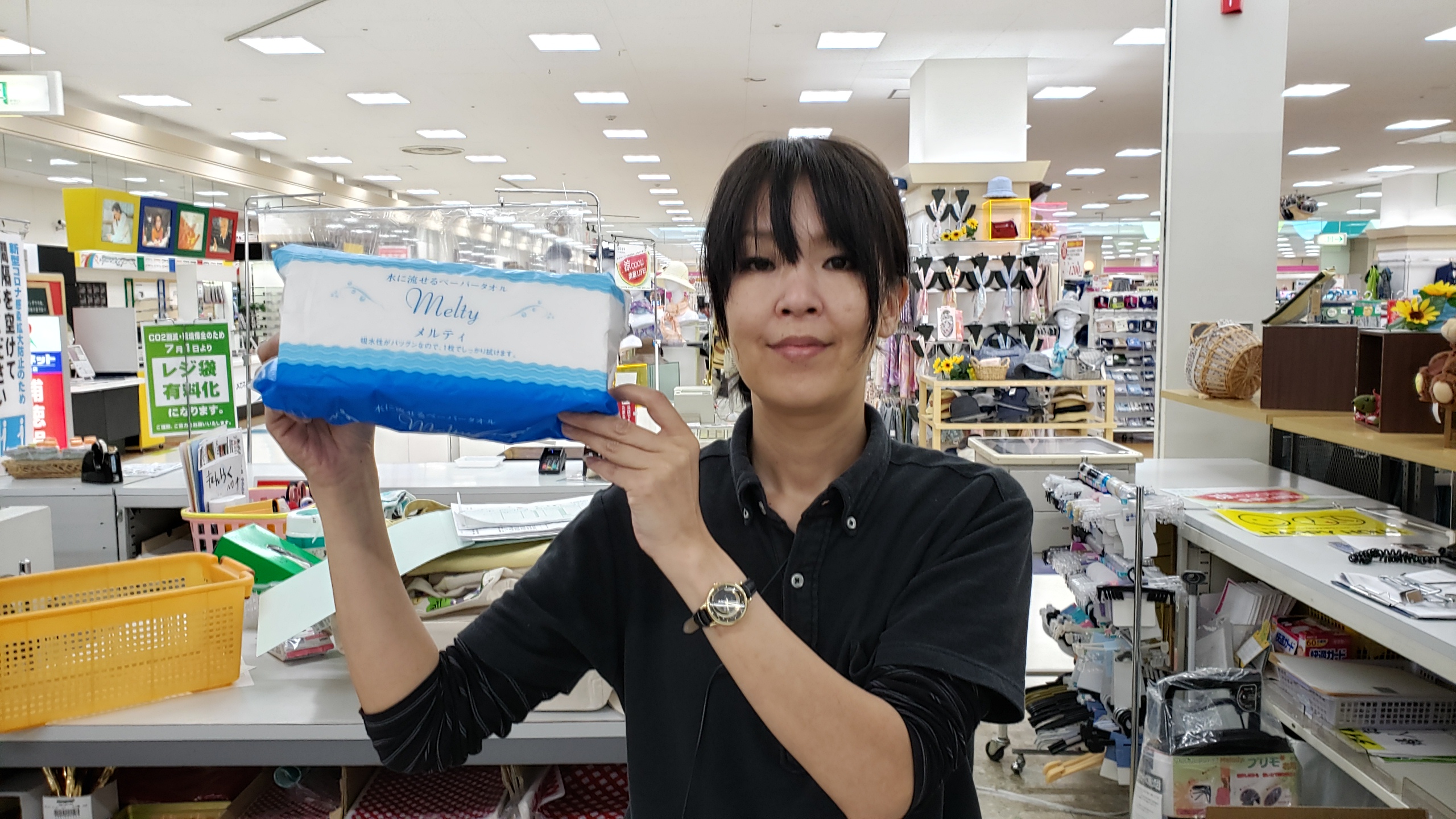 家庭消耗品コーナーからは! おすすめ!水に流せるペーパータオル メルティーです。吸水性がバツグンなので1枚でしっかり拭けます!視かも環境と自然にもさやしいペーパータオルです!価格は120組240枚入りで198円です。是非お買い求めくださいませ。