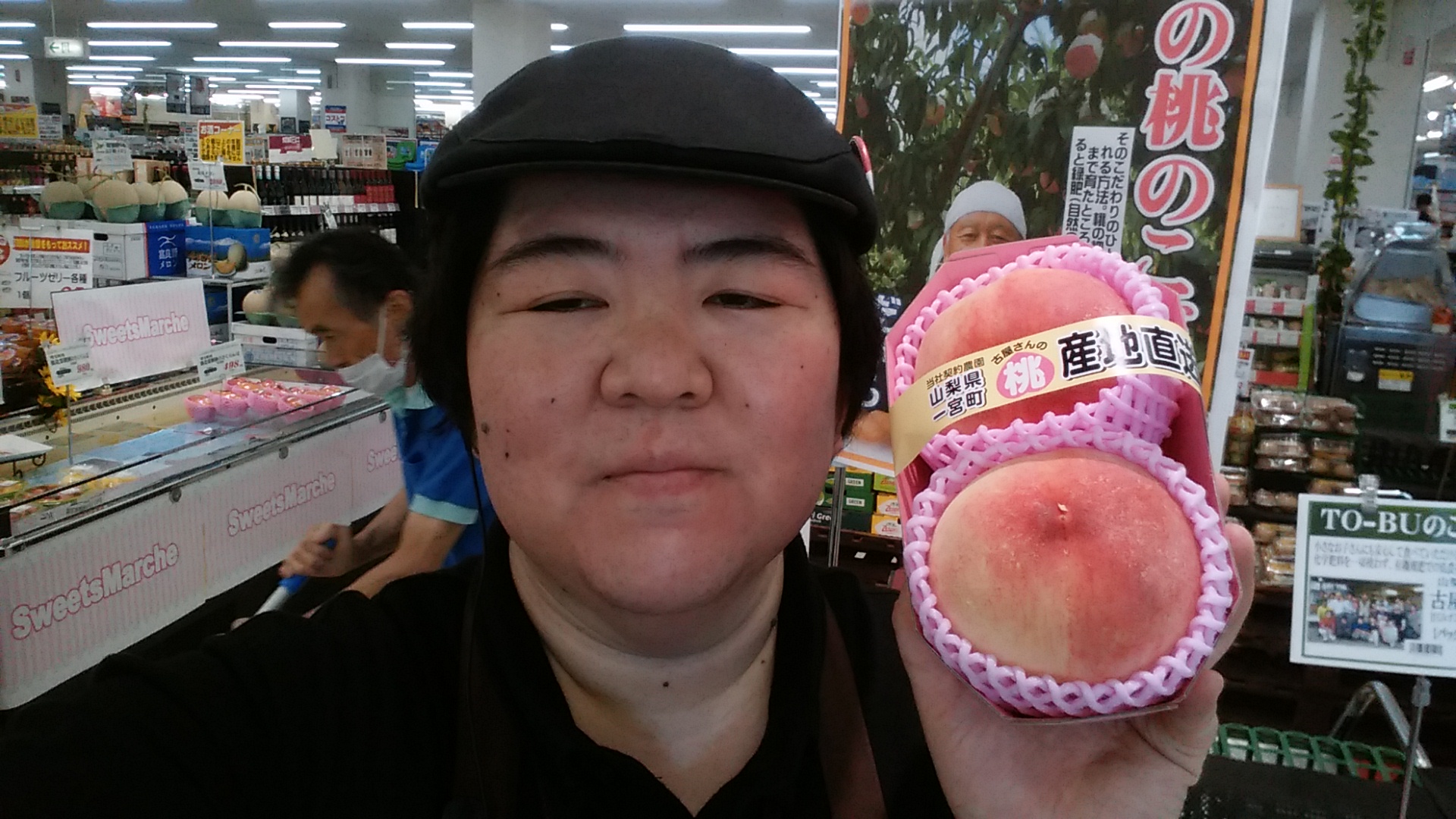 おはようございます。青果担当奥瀬です。山梨から?美味しいももが届いてます。山梨産古谷農園のもも 特大サイズ2玉1パック 698円です。是非ご利用ください。