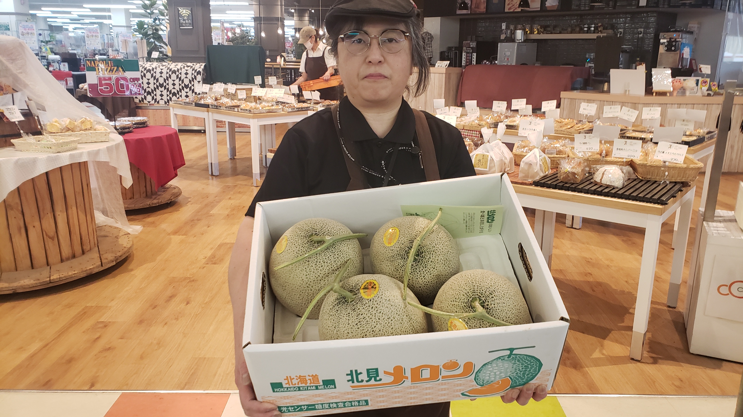 青果コーナーのオススメ!北見メロンが、入荷しました。お中元に、4玉1箱4990円とお買得