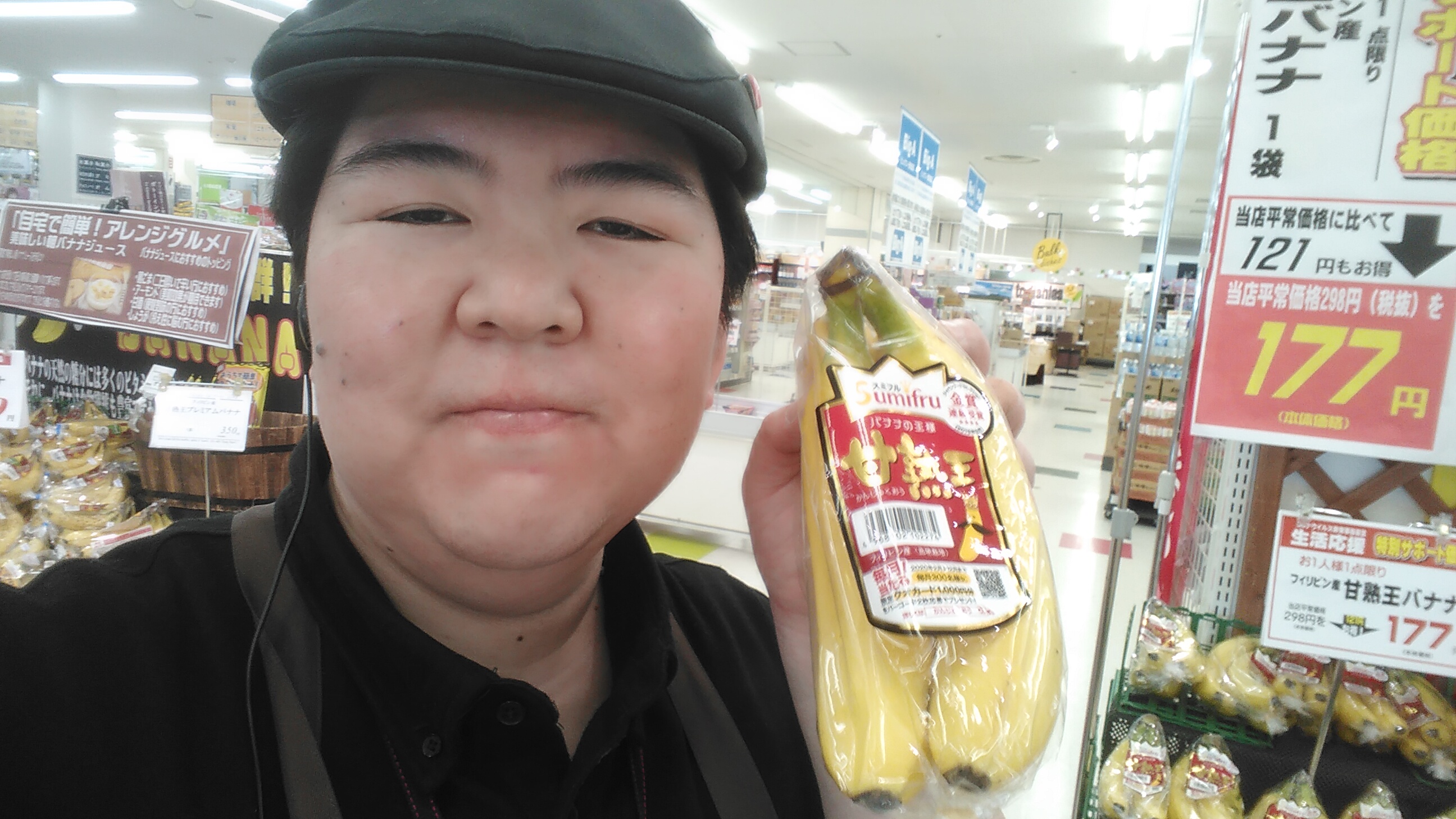 おはようございます。青果担当奥瀬です。本日は甘熟王バナナがお買い得です。フィリピン産甘熟王バナナ 1袋 177円です。是非ご利用ください。