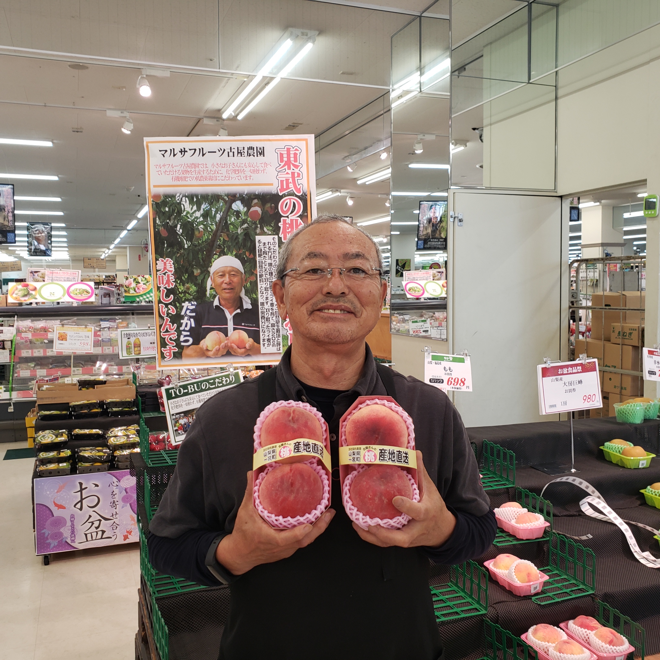 青果コーナーのおすすめ。山梨県古屋さんの桃。みすみずしく甘い!お盆のフルーツに、おすすめします
