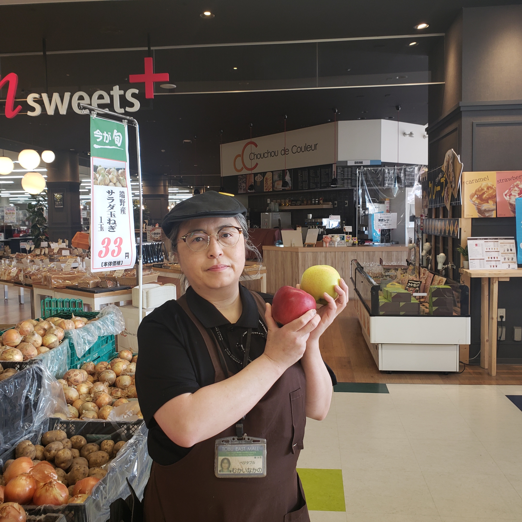 青果コーナーのおすすめ。青森産さんつがる、きおうリンゴ入荷しました。新物のリンゴです。