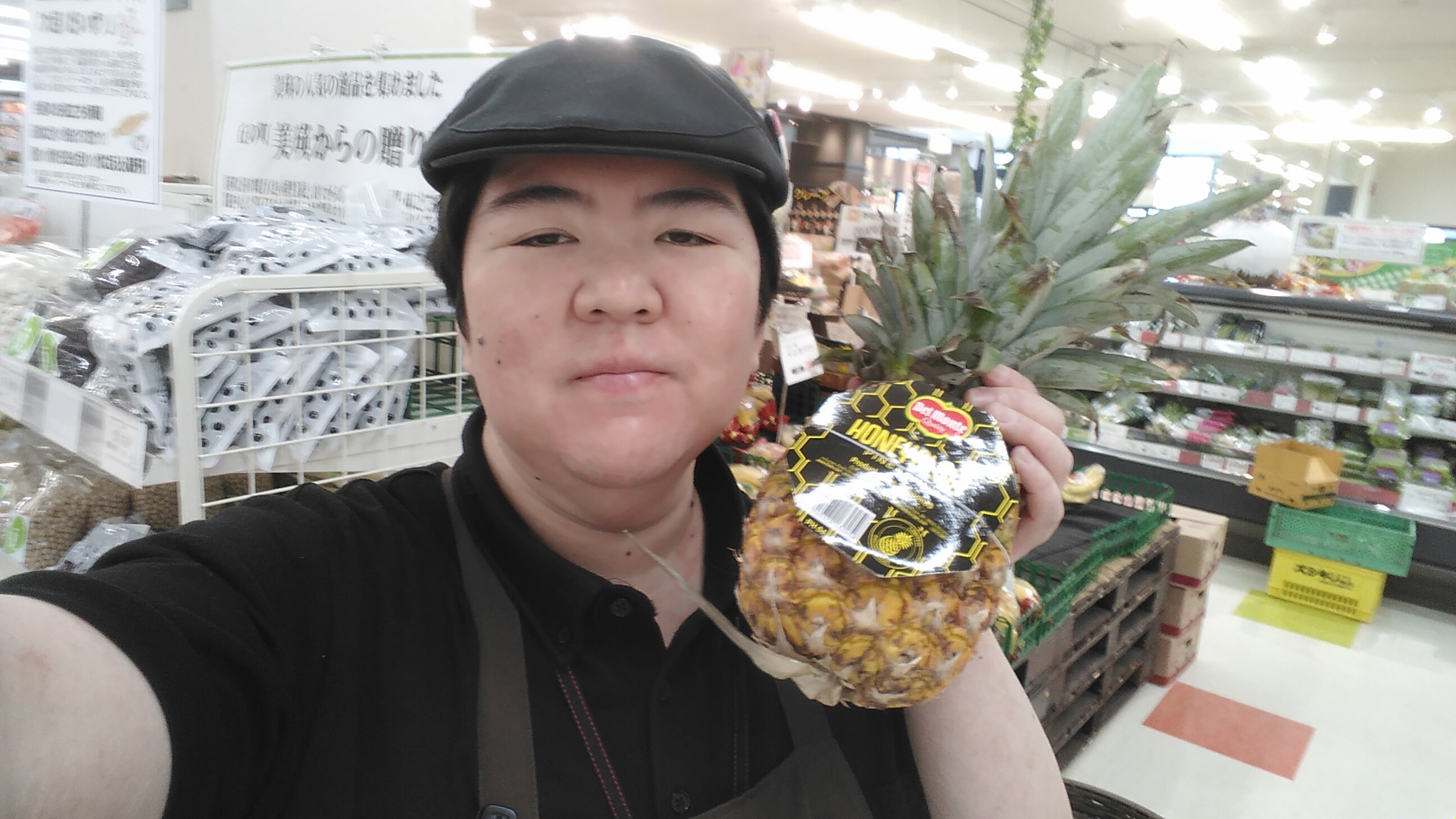 おはようございます。青果担当奥瀬です。本日はハニーグローパインのご紹介です。木の上でギリギリまで熟した状態で収穫した、甘味の強いパインです。本日はこの、フィリピン産 ハニーグローパイン、1玉 498円と大変お買い得です。是非1度、ご賞味ください。