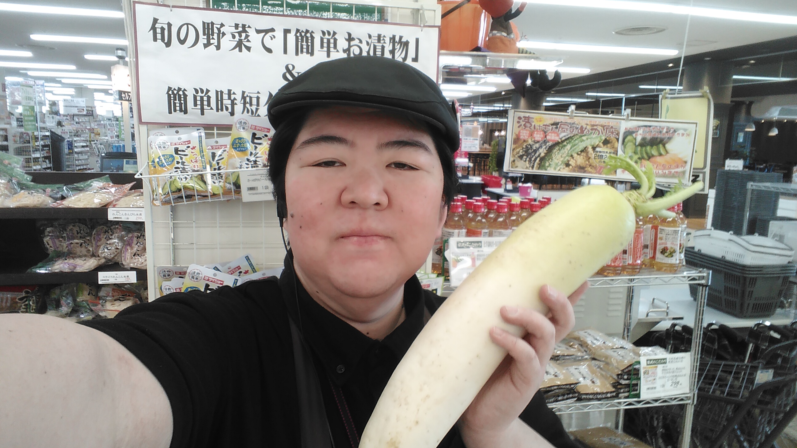 おはようございます。青果担当奥瀬です。本日は大根がお買い得です。北海道産大根 1本99円です。是非ご利用くださいませ。