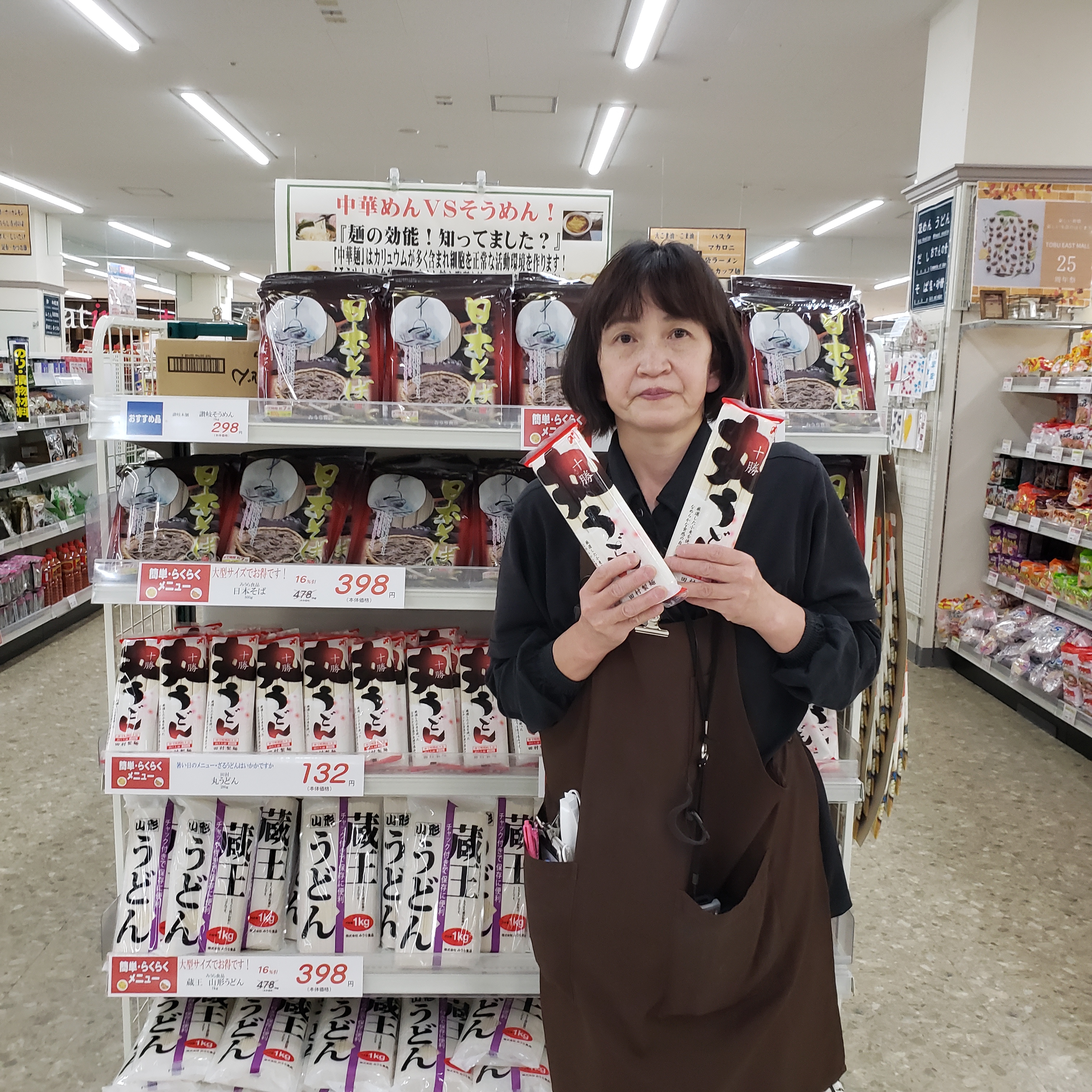 食品コーナーからは!温めても、冷やしても!美味しい、 田村製麺 十勝丸うどんです 厳選した小麦粉を使ったなめらかな食感の自慢の逸品です。価格は280g入りで132円です。是非お買い求めくださいませ。