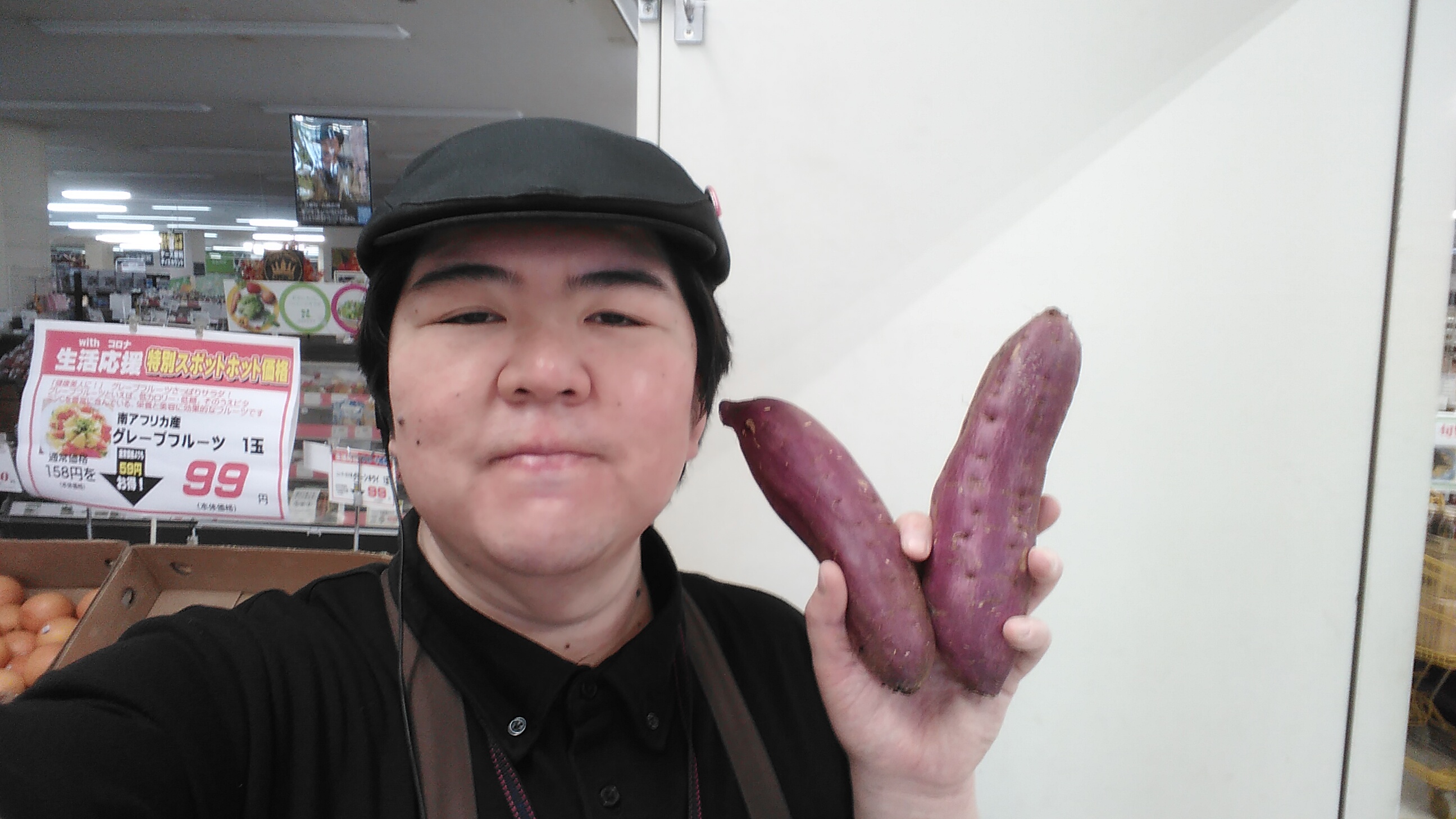 おはようございます。青果担当奥瀬です。本日は、さつまいもがお買い得です。千葉産 新物さつまいも (紅あずま) 1本 128円です。お買い得です。是非ご利用ください。