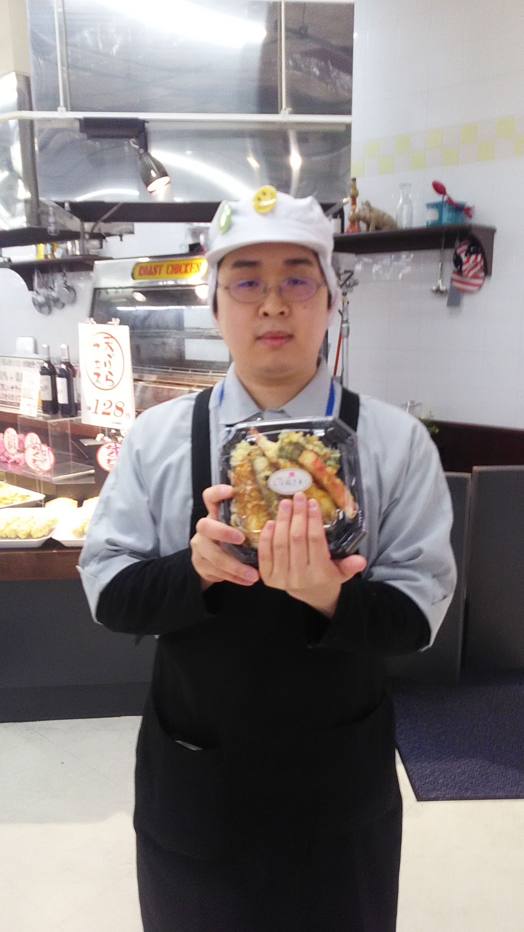 おはようございます。惣菜担当小川です。美瑛産の七分搗きの米を使用しいか天、カニカマ、ピーマン天、海老天、なす天の五種類入ってます。