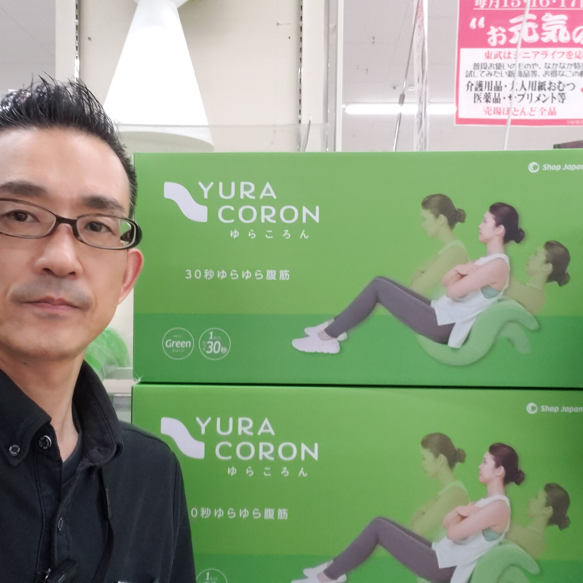 家電コーナーからは!人気のショップジャパン ゆらころんです。座って後ろにゆらゆらするだけで簡単に腹筋運動ができるエクササイズマシンです。30秒ゆらゆら腹筋! 価格は8980円です。是非お買い求めくださいませ。